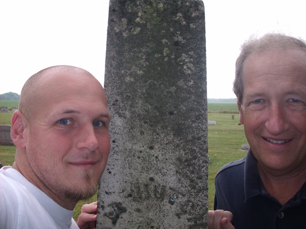 the second person i would like to honor is esrom hutchings, william's father, and my 4th-great-grandfather. although i don't have a picture of esrom, he served as a private in the american army during the war of 1812. here is a picture of his grave, located in the same cemetery as william. esrom is on the left (in the pic), and his wife on the right. up close of the memorial me and my dad by esrom's grave