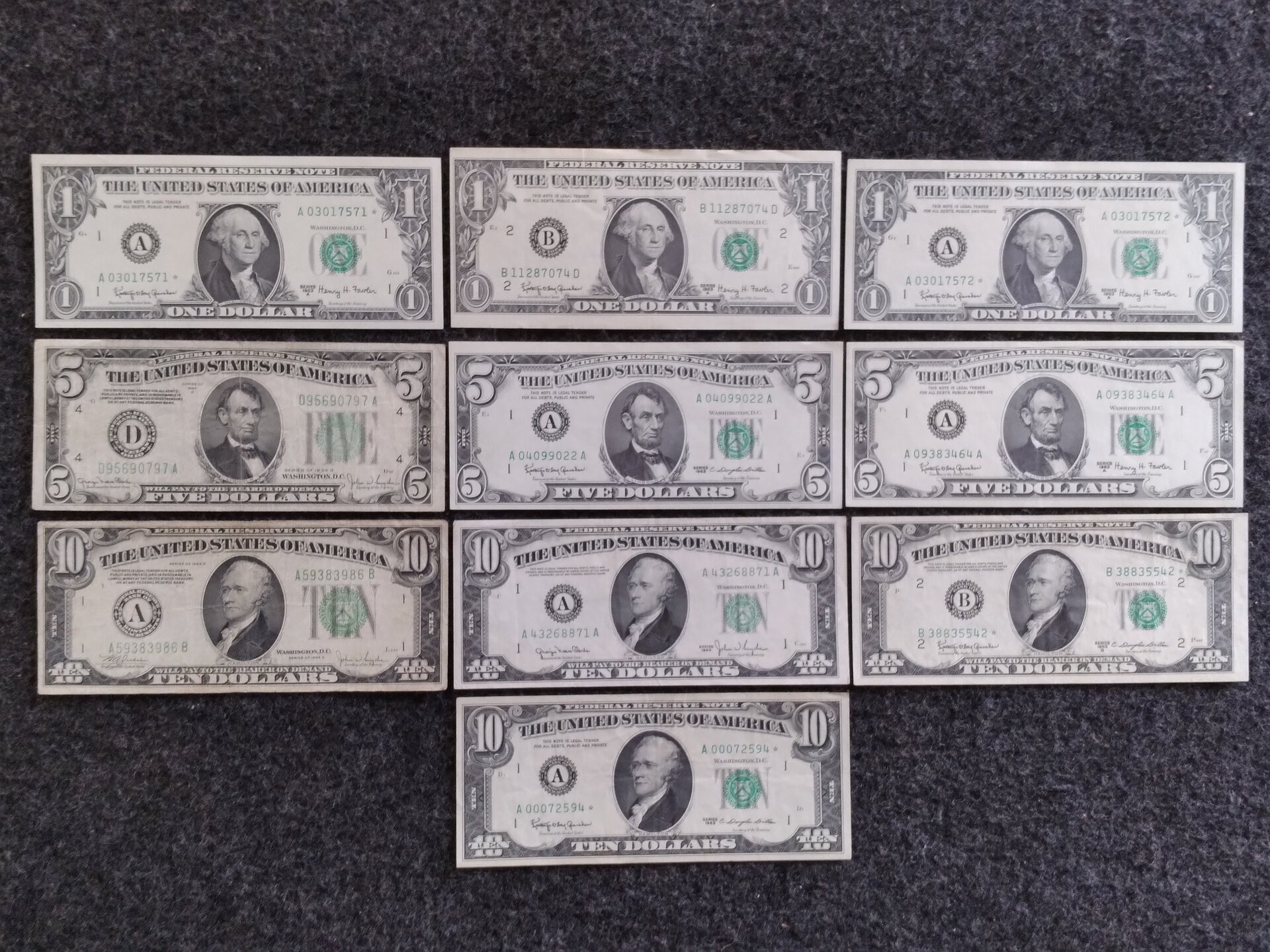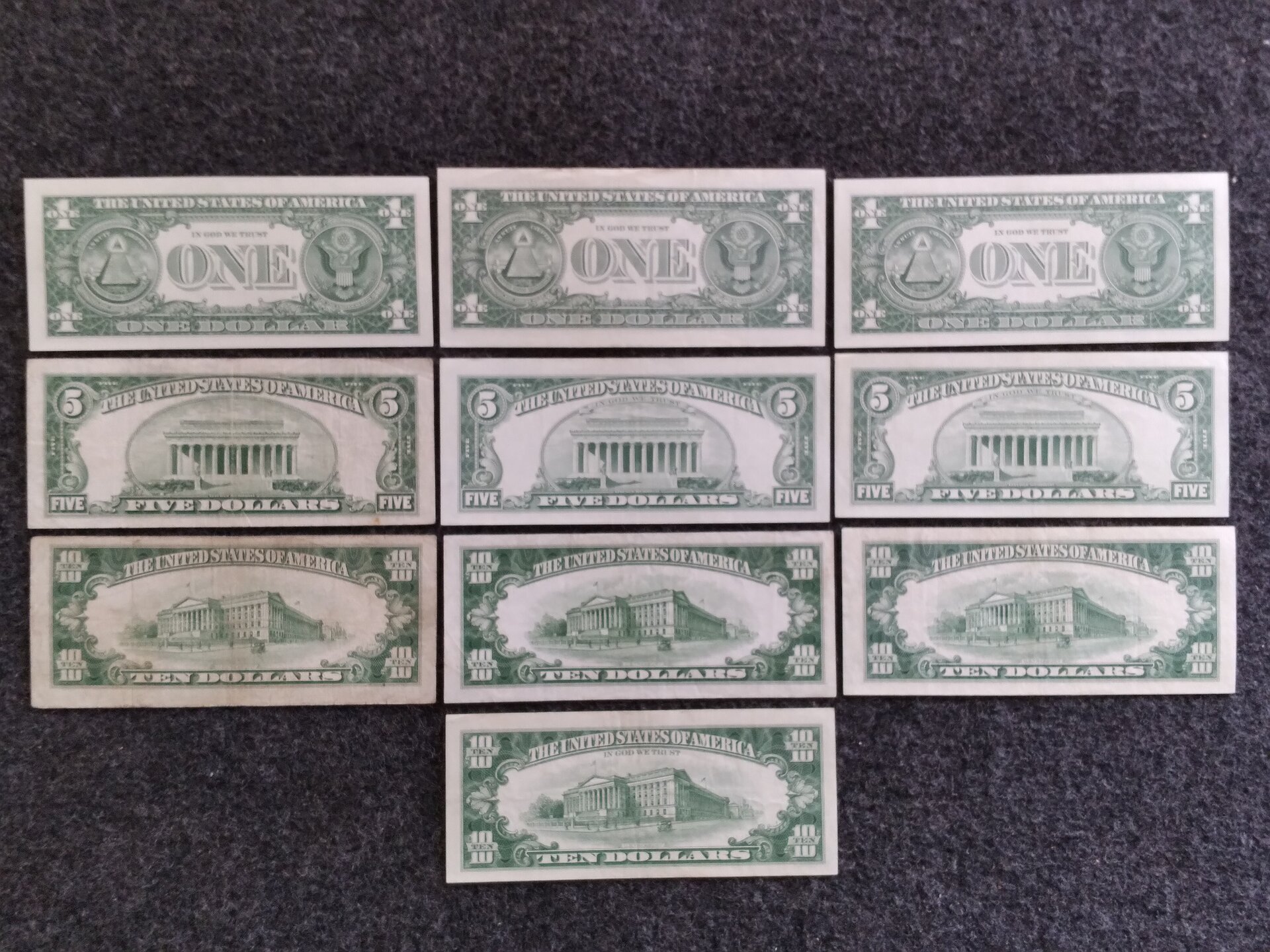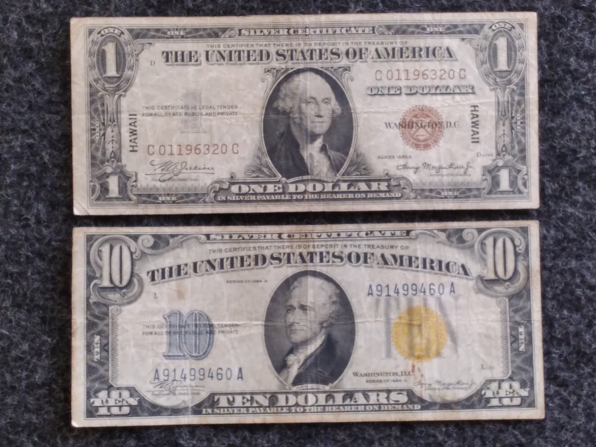 Advertised here first, the last of my note collection (I thinned out this collection in a couple BST posts on this site last year.) 1) Silver Certificates - SOLD 1614 $1 1935E (2) nice 1616 $1 1935G nice 1620 $1 1957A (7) nice-AU 1621 $1 1957B star circ 1653 $5 1934C circ 1705 $10 1934D fair 2) Silver Certificates special - SOLD 2300 $1 1935A Hawaii worn 2309 $10 1934A yellow seal fair 3) United States Notes - SOLD 1509 $2 1953 (2) fair-nice 1510 $2 1953A (4) nice-AU 1511 $2 1953B nice 1512 $2 1953C AU 1514 $2 1963A crisp 1532 $5 1953 AU 1536 $5 1963 (2) fair-AU 4) Federal Reserve Notes - SOLD 1901-A $1 1963A (2) consecutive star crisp 1901-B $1 1963A cut oversized AU 1960-D $5 1934D fair 1967-A $5 1963 crisp 1968-A $5 1963A crisp 2008-A $10 1934C fair 2010-A $10 1950 AU 2014-B $10 1950D AU 2016-A $10 1963 star AU 5) Federal Reserve Notes Barr - no longer available 1902- $1 1963B all five Federal Reserve Bank issues crisp Free shipping by USPS Priority Mail tracked and insured to price paid. Payment by check, POMO or paypal okay. Thanks for looking.