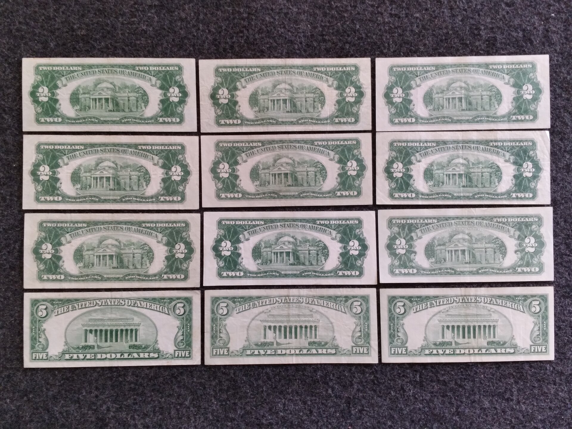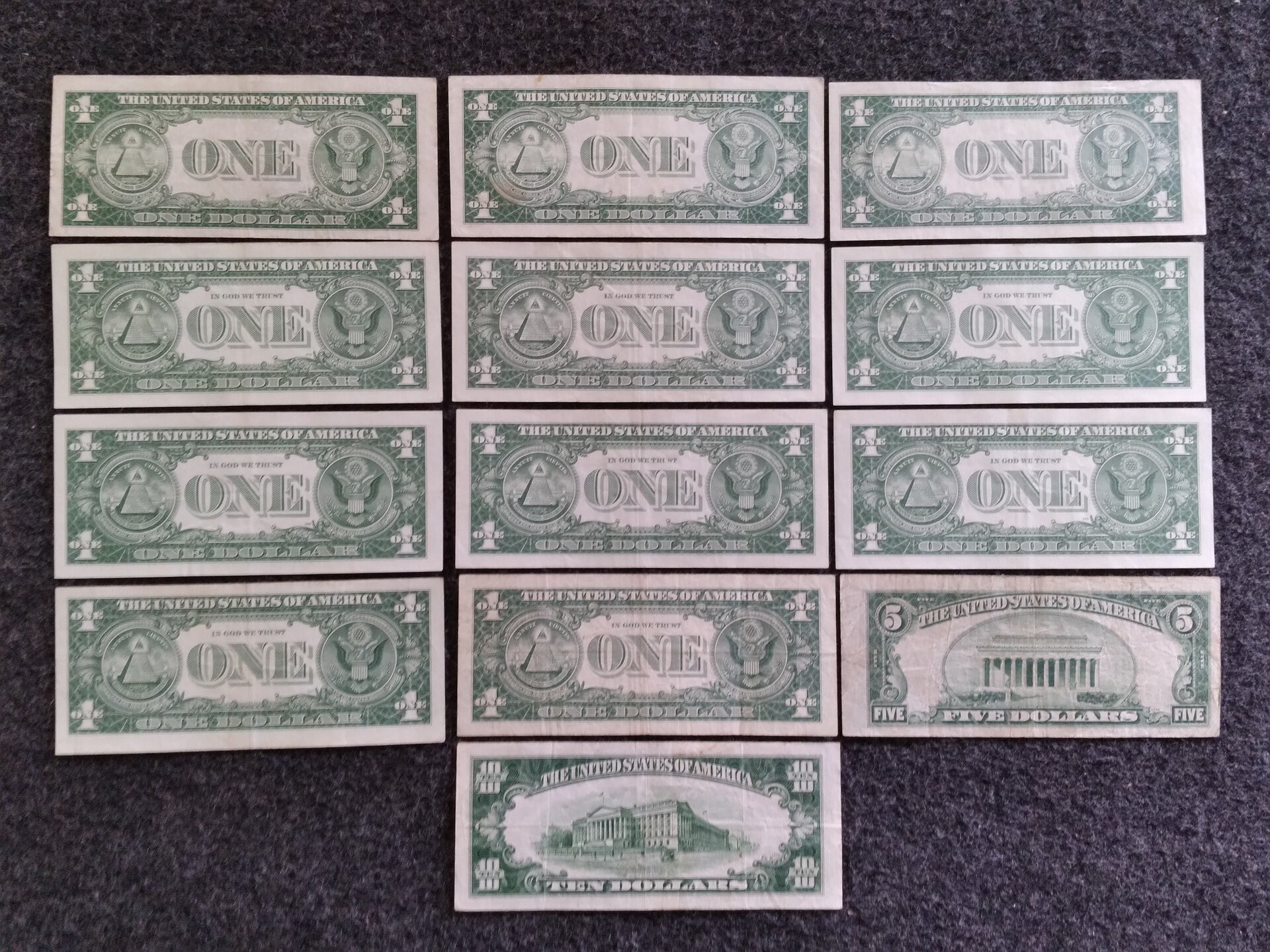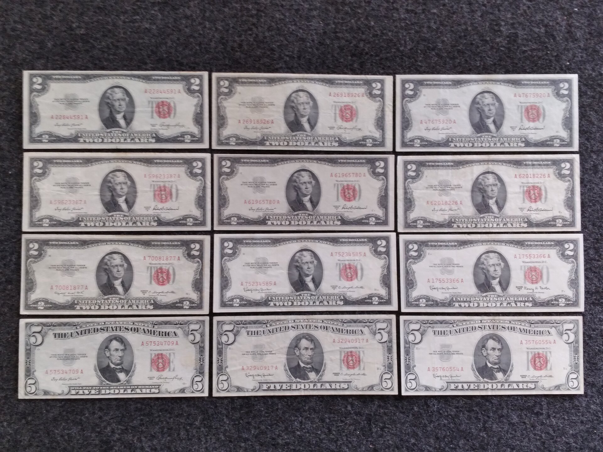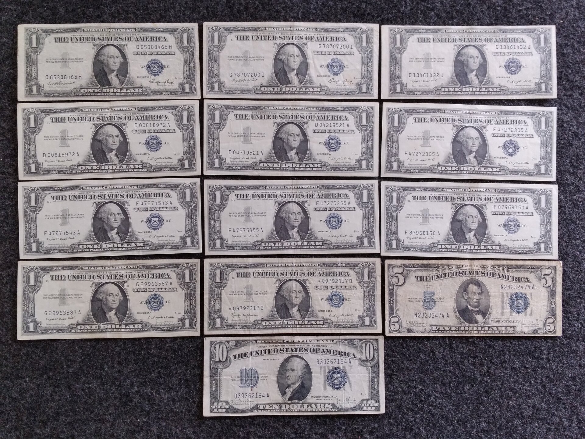 Advertised here first, the last of my note collection (I thinned out this collection in a couple BST posts on this site last year.) 1) Silver Certificates - SOLD 1614 $1 1935E (2) nice 1616 $1 1935G nice 1620 $1 1957A (7) nice-AU 1621 $1 1957B star circ 1653 $5 1934C circ 1705 $10 1934D fair 2) Silver Certificates special - SOLD 2300 $1 1935A Hawaii worn 2309 $10 1934A yellow seal fair 3) United States Notes - SOLD 1509 $2 1953 (2) fair-nice 1510 $2 1953A (4) nice-AU 1511 $2 1953B nice 1512 $2 1953C AU 1514 $2 1963A crisp 1532 $5 1953 AU 1536 $5 1963 (2) fair-AU 4) Federal Reserve Notes - SOLD 1901-A $1 1963A (2) consecutive star crisp 1901-B $1 1963A cut oversized AU 1960-D $5 1934D fair 1967-A $5 1963 crisp 1968-A $5 1963A crisp 2008-A $10 1934C fair 2010-A $10 1950 AU 2014-B $10 1950D AU 2016-A $10 1963 star AU 5) Federal Reserve Notes Barr - no longer available 1902- $1 1963B all five Federal Reserve Bank issues crisp Free shipping by USPS Priority Mail tracked and insured to price paid. Payment by check, POMO or paypal okay. Thanks for looking.