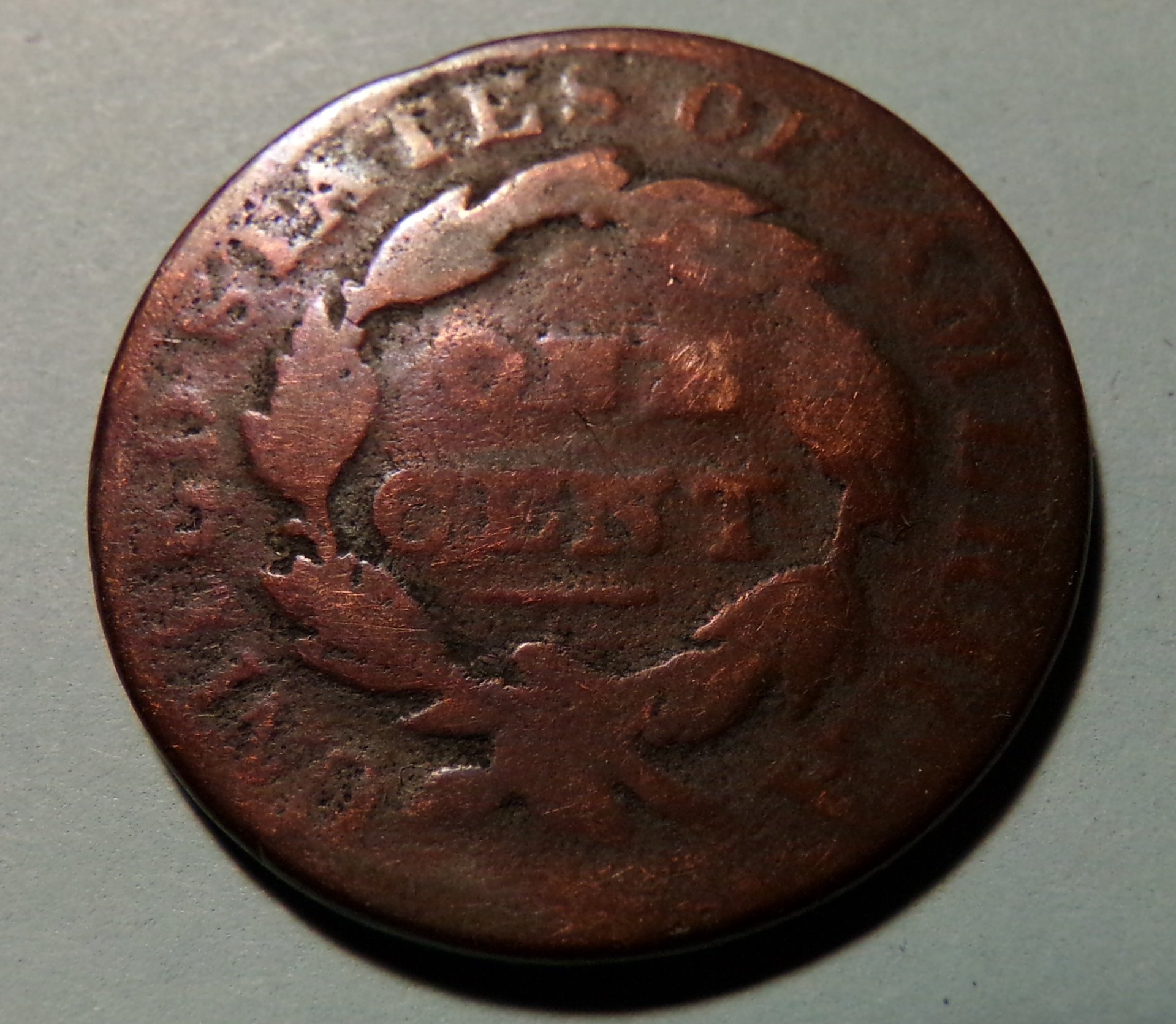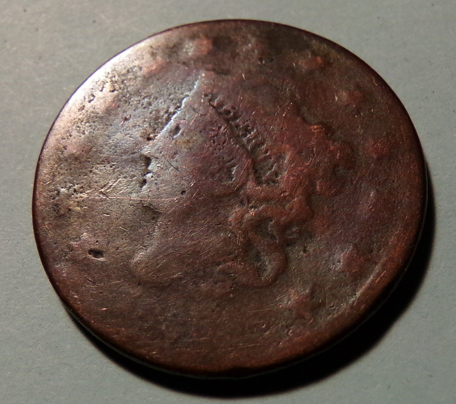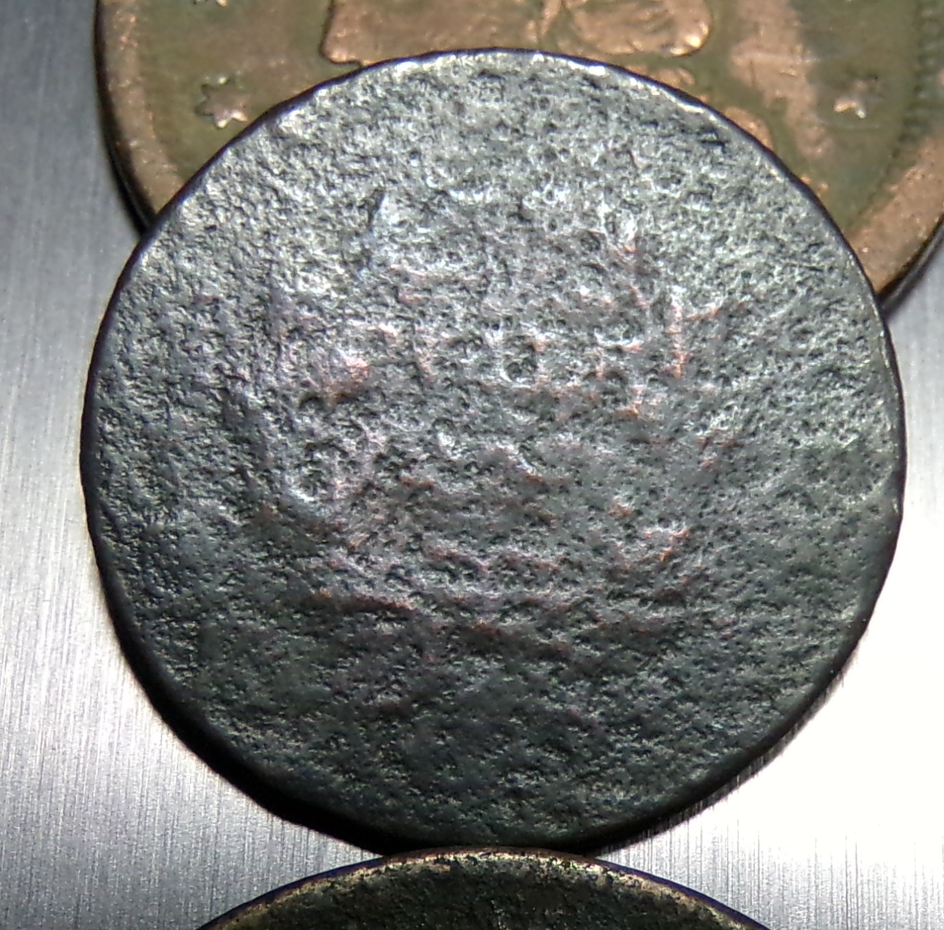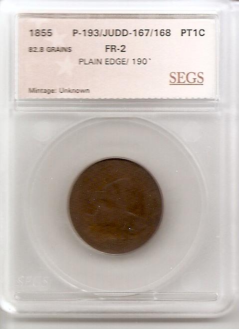 This may be the lowest grade U.S. pattern coin in existence. It's an 1855 Flying Eagle Cent. It got certified as Fr-2. There are far fewer of these around than there are 1856 Flying Eagles. I suspect that it long served as someone's pocket piece.