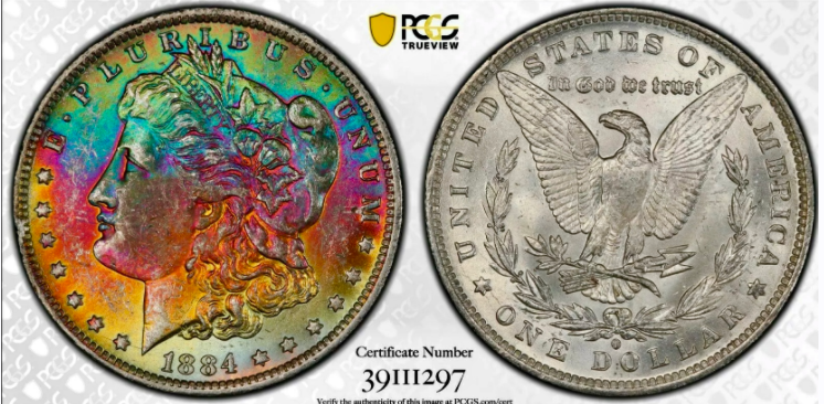 For the 1882-S Morgan, I have to say this coin has a lot going for it. There are some nice transitions on the right side, and a good amount of green, which is always nice. The colors on the right side are vibrant, and I could easily see this coin being considered a monster if that type of coloring extended throughout the entire obverse. This coin should also literally be the plate coin illustrating pull away toning, which is always nice to see. Once you move past that crescent of vibrancy from about 12:30 to 6:30, then the coin has less going for it. Given that the entire obverse isn't blanketed with color, I do like the fact that somehow, there is little to no color on about half of Liberty's hair. We also have some transitions from yellows to blues, with a hint of burgundy and the continuation of pull away toning on the stars. And, of course, in terms of toning, the reverse is just a solid "meh." I would totally own this coin. Take everything I just said, and then put it in an MS-65 rattler with a CAC sticker, and you've got a winner. In pure color terms, I'd call this a 4.8. IMO, it's held back by the relative lack of vibrancy on the face, and, compared to the late 2nd into 3rd cycle toning on the right, those 1st cycle blues are not doing it any favors. In fact, it may have made a better impression were the left side the more vibrantly toned one, simply because that's where the prime focal points of the coin are. I would definitely pay a pretty good premium for this coin.