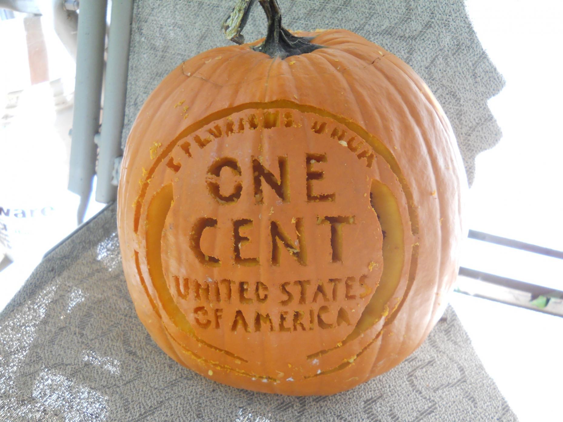 Its halloween and pumpkin carving season. As many of you probably saw, I carved the reverse of a wheatie into a pumpkin and plan on doing the opposite side as lincoln tomorrow. Someone suggested I make a pumpkin thread so I am doing so. Please everybody get involved and go carve a pumpkin! Support your local pumpkin farmers! Please don't let this thread die til after Hallow's Eve! I'll post pics of mine completed tomorrow morning. Here's one to get us started though. Also, if you are not participating and have an idea, post it please. If I get enough people I may make a contest out of it.