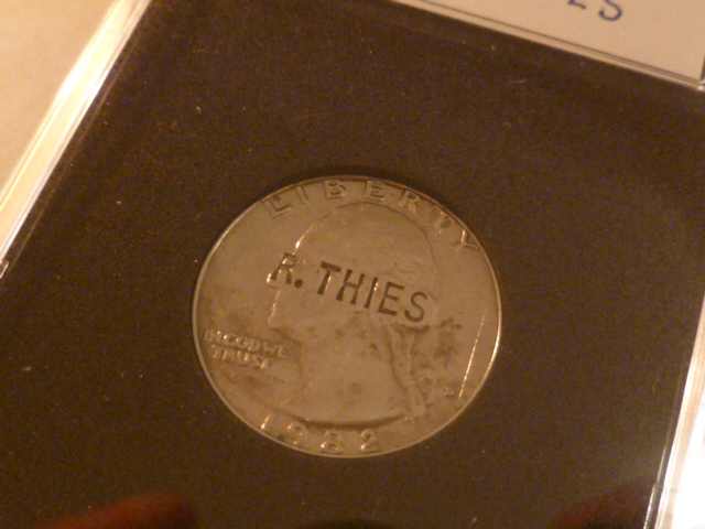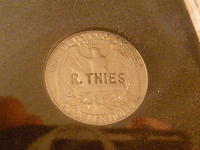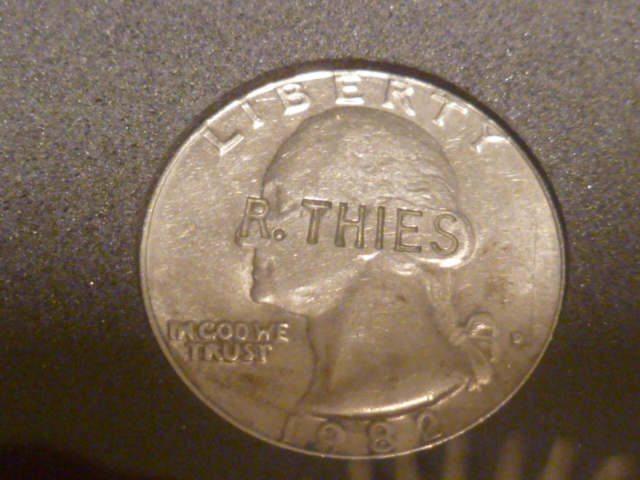 I was lucky enough to find one of these in circulation a couple of years ago. I don't yet have Brunk's book on counterstamps but I know that the "R. THIES" stamp is mentioned. I don't know what Brunk has to say about it but the story online is that these were stamped at the US Mint, though I find that hard to believe. Does anyone have any additional information regarding this stamp or know if Brunk provides any additional information to the online rumors?