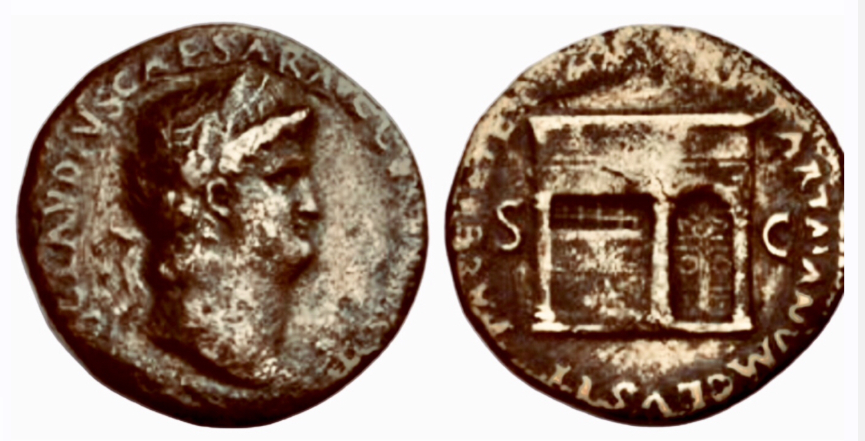 The columns on this coin support temple structures for Nero's deified wife Poppaea Sabina and their daughter Claudia who died in 63 AD at the age of four months. It is the only coinage issued in Claudia's name. When Claudia was born, Nero honored her and her mother with the title Augusta. Poppaea was Nero's second wife, and he was her third husband (Otho was her prior husband). Pappaea died in 65 AD (killed by Nero while pregnant with another child according to Tacitus, Suetonius, and Cassius Dio). Nero ended his own life three years later at age 30.