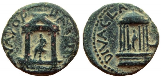 [DI]VA POPPA[EA AVG], statue of Diva Poppaea seated left within distyle temple set on high podium. / DIVA CLA[VD NER F], statue of Diva Claudia standing left on basis within round hexastyle temple set on high podium.