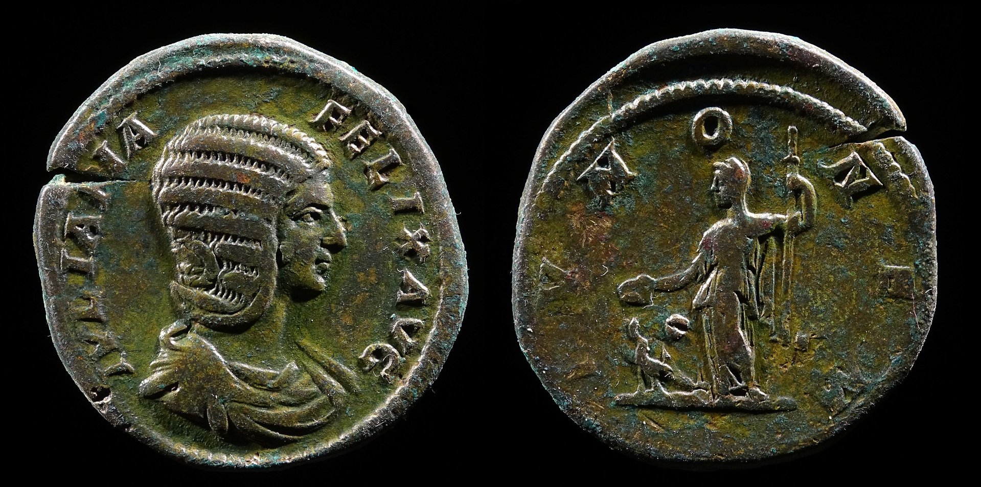Julia Domna seems to have spent a lot of time doing her coiffure I can't even imagine how to do this one, holy molly it must also have been a headache to prepare the die and struck it on coins: Denarius, Rome, 196 - 211 AD 15 x 17 mm, 3.02 g; Ref.: RIC IV Septimius Severus 560; Cohen 97; Obv.: IVL(IA AVG)VSTA Bust of Julia Domna, hair waved and coiled at back; draped, right Rev.: IV(NO) REGINA Juno, veiled, draped, standing left, holding patera in extended right hand and scepter in left hand; at feet, left, peacock