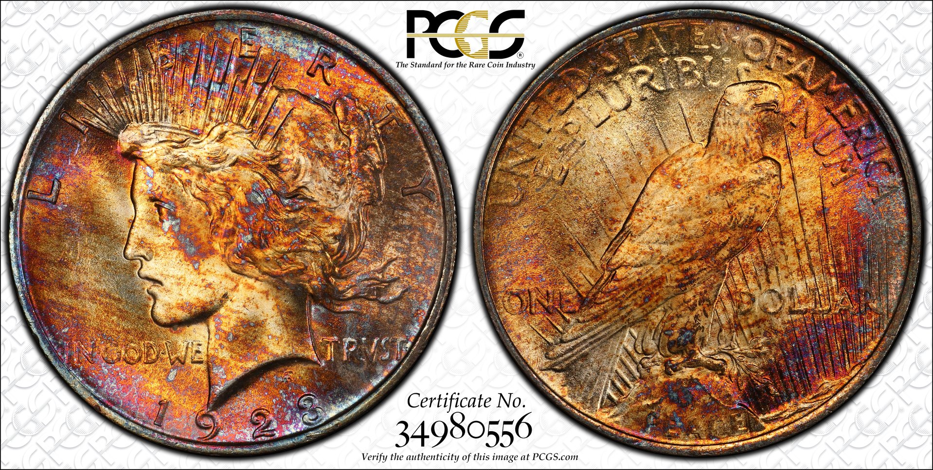This Peace Dollar obviously encountered some weird storage condition, but I collected toned Peace Dollars and these ugly colors and mottled patterns were the norm, not the exception. Additionally, this is a TruView so the colors won’t be as vibrant in hand as they are in the photo.