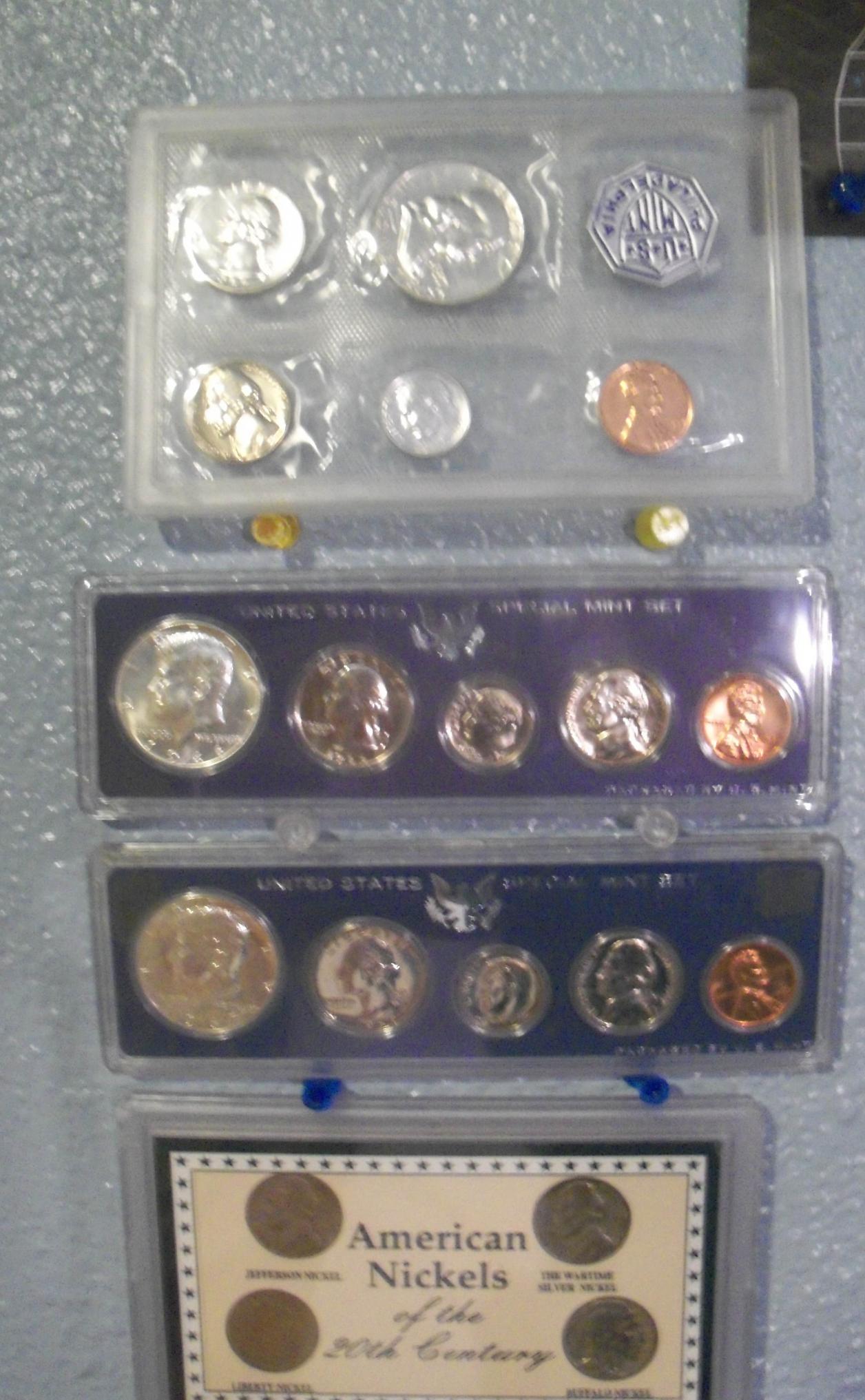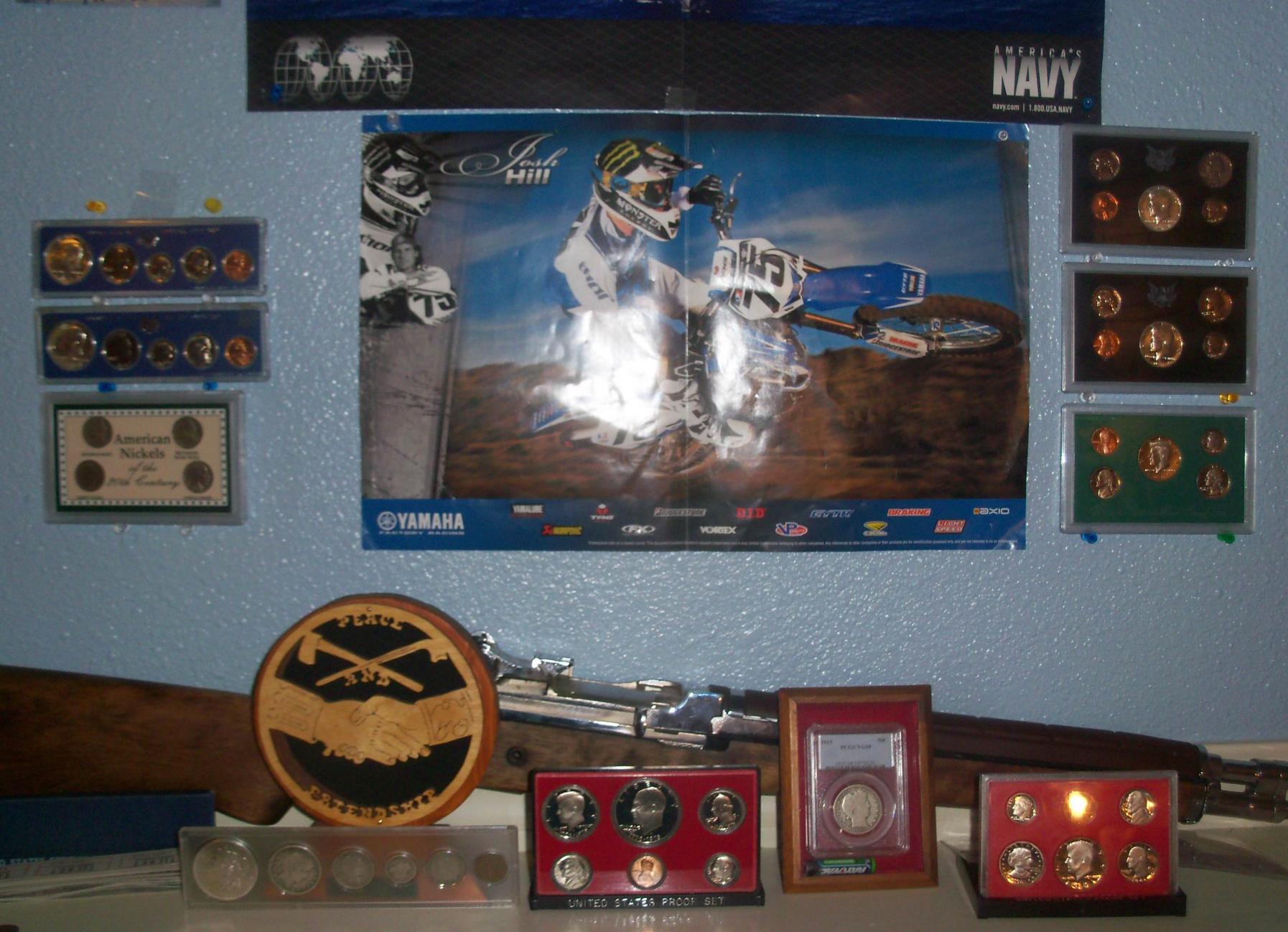 Disclaimer: I did not buy any sets from Littleton Coin Company Warning: Littleton Coin Company overcharges for their products. Advise that you shop elsewhere. So, if you are like me, you are proud of your collection and want to show it off... As for me, I hang a lot up in my room. But up until today, I had always been ticked off because I can't hang up my pre-65 proof sets or any of my mint sets. Today, while going through my coins, I dropped one of those pesky "Americana Series Vanishing Classics Collections" with junk silver coins in them not worth a dang. I tried putting it back together, then it hit me like a wrecking ball to Homer Simpson Here's a crappy photo of said set. Crack the junk open. take flimsy proof/mint set Place it in the plastic case and display as you wish. And just because, I'll show you the whole banister/wall with a crummy pic. And a description of what's there. On the upper left is a 66 and 67 SMS Set. Under it is a beautiful junk set of nickel types of the 20th century filled with culls (Will be broken out soon) On the banister is my M1 replica rifle I use for Armed Drill Team in JROTC. A wood carving of the peace medal shown on the reverse of the reverse of a 2004 westward journey nickel. In front is a hand-assembled set including a morgan dollar, barber coins, and a IHC. To the right is a 1976 Proof set, a 1915 Barber half PCGS VG-08 and a 1981 Proof set. On the top left is a 1968 proof set followed by a 1970 proof set and followed by a 1995 proof set. And dead center is Josh Hill, a well known dirtbike racer.