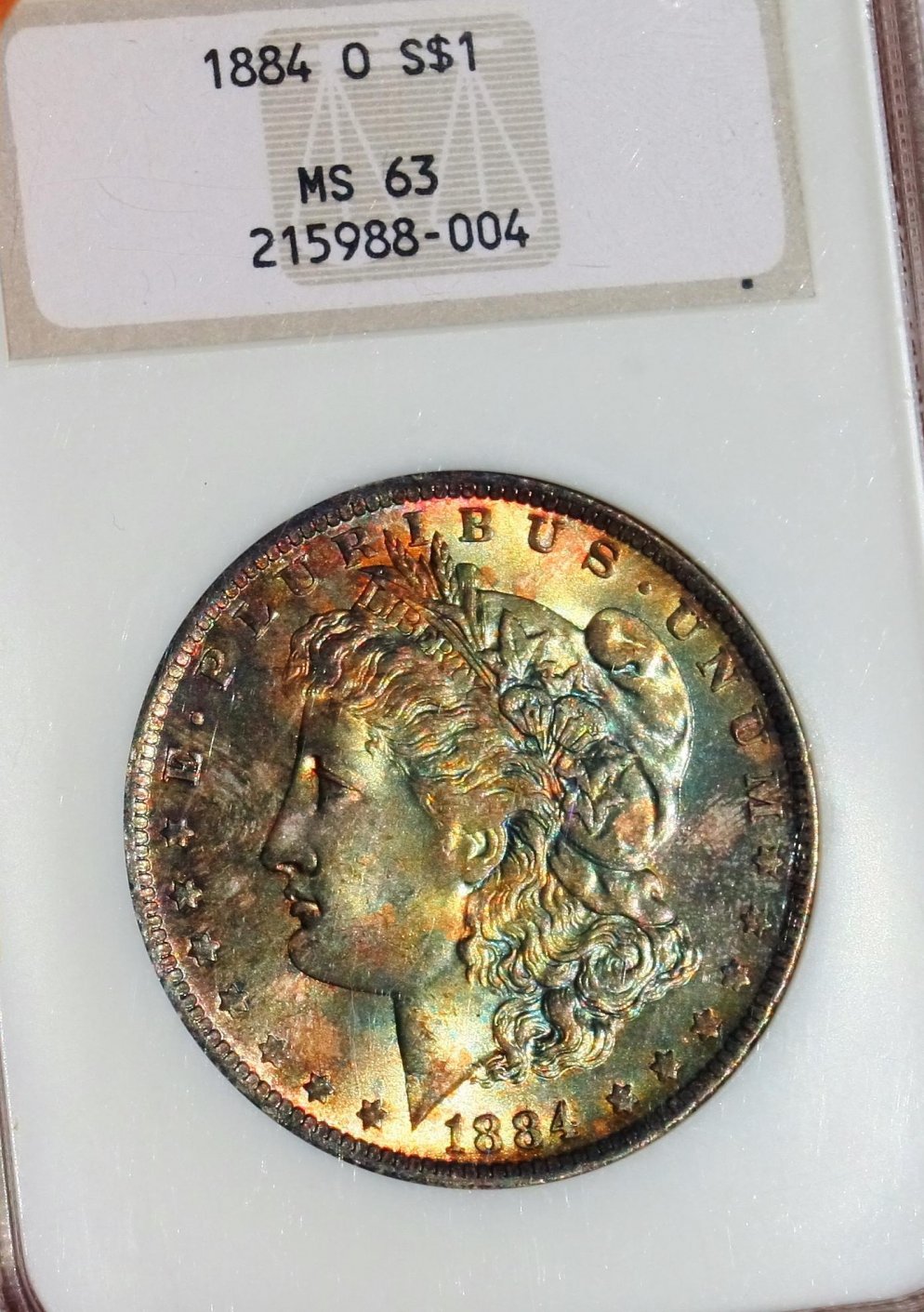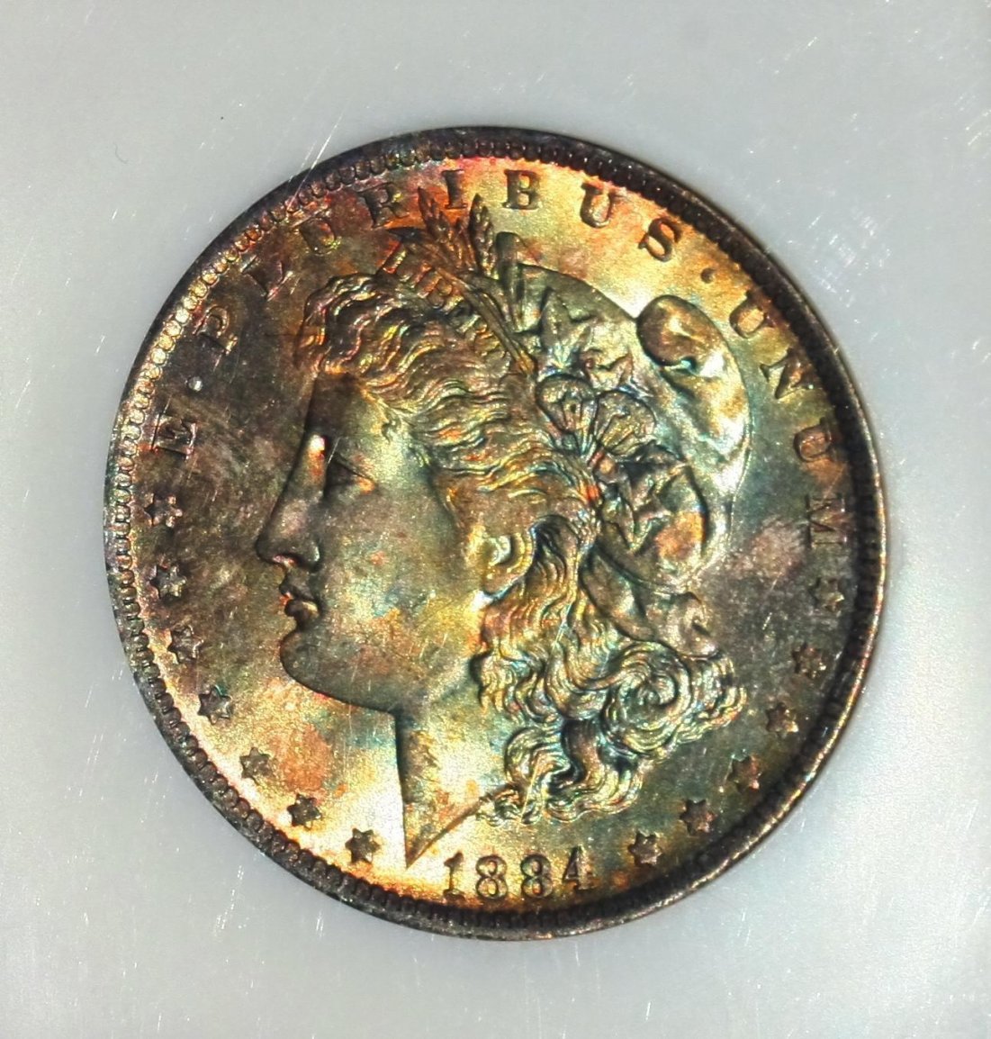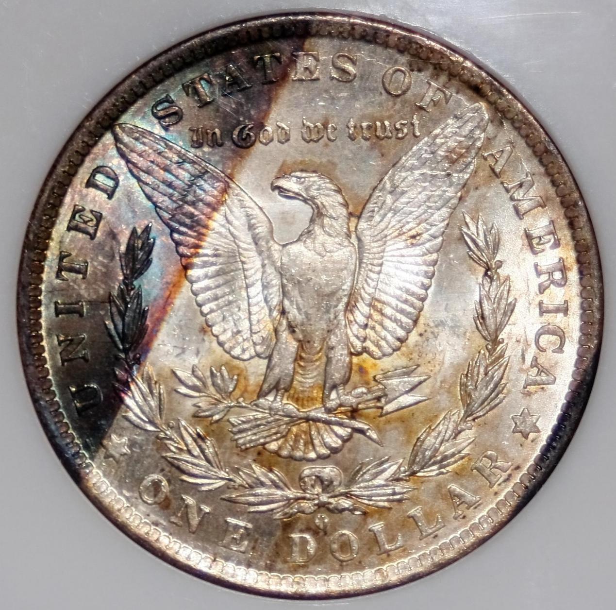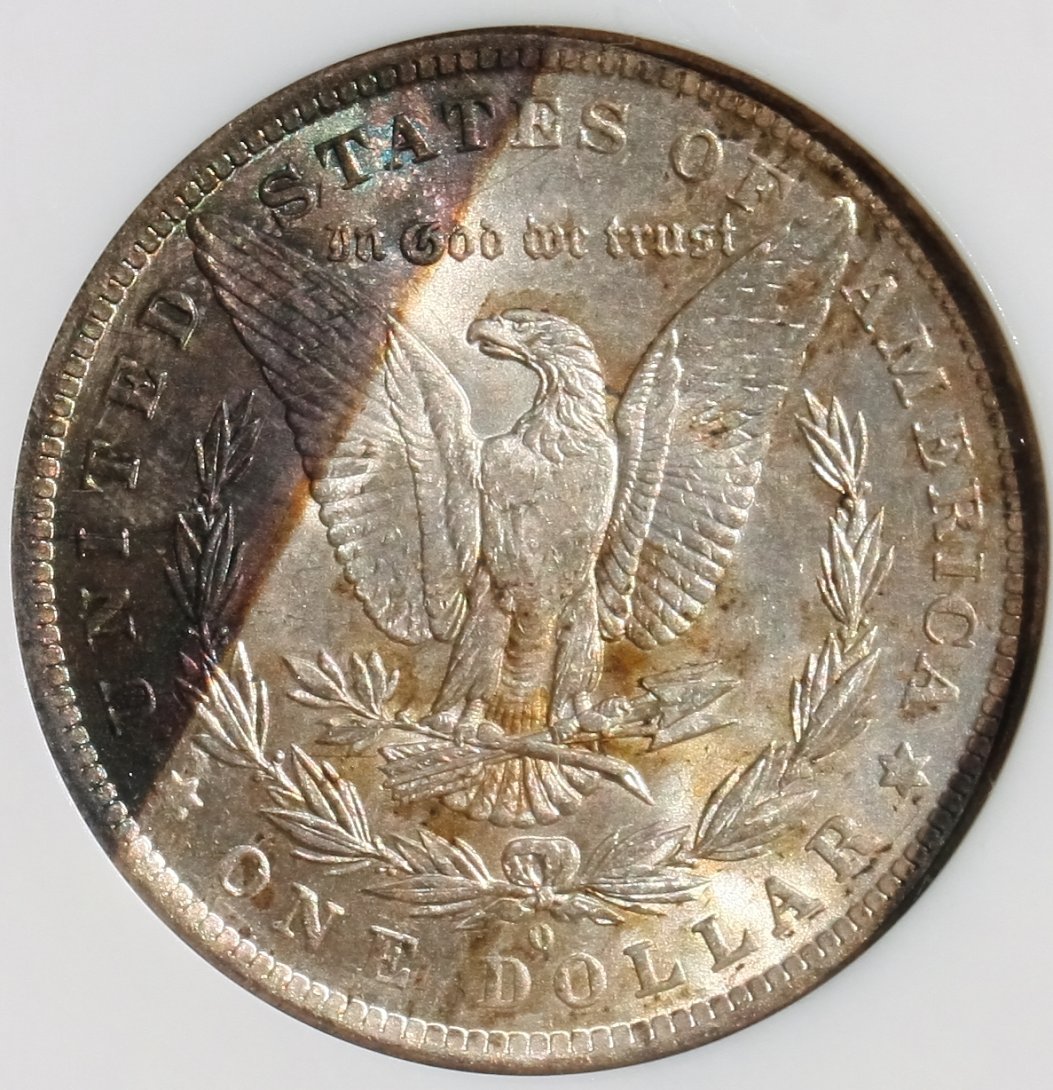Here's an example of different lighting and it's effects. Pretty rude and basic illustrations but you can see my point clearly. 1st pic of the reverse is in a light flood, similar to the lighting conditions used in my previous post.... think I burned my eyebrows snapping this picture... Anyway, the reverse toning is black just about every way you look at it except under heavy light,,, in heavy light the black area presents blues and reds that this picture does not fully capture. The last picture of the reverse is more like what the coin looks like under what I'd call nomial unfocused coin viewing light... in ambient light, it's pretty much black with a brown line sperating the black from the silver field. The obverse is in sunlight and is a fair representation of what the coin looks like in that lighting. It's a pretty coin and one of my favorite toners.