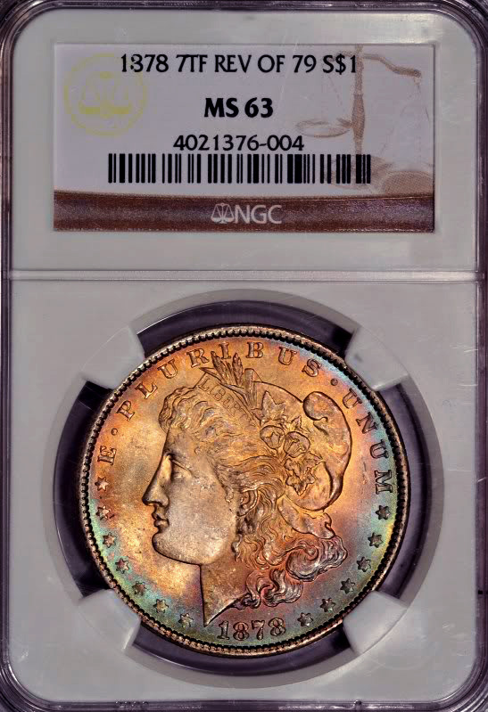 Hey oval, I took the seller's photo's of the NGC slab of the 1878 and then tried to color correct the slabs to white. So these corrected photos are pretty close to what the coin looks like in hand -- except to my eye, the toning around the rim looks a bit more blue than the photo suggests (the photo tone is a bit more green). Doesn't this look a tiny bit like a toned gold coin? Tell you what. Photographing and imaging coins is a real art!