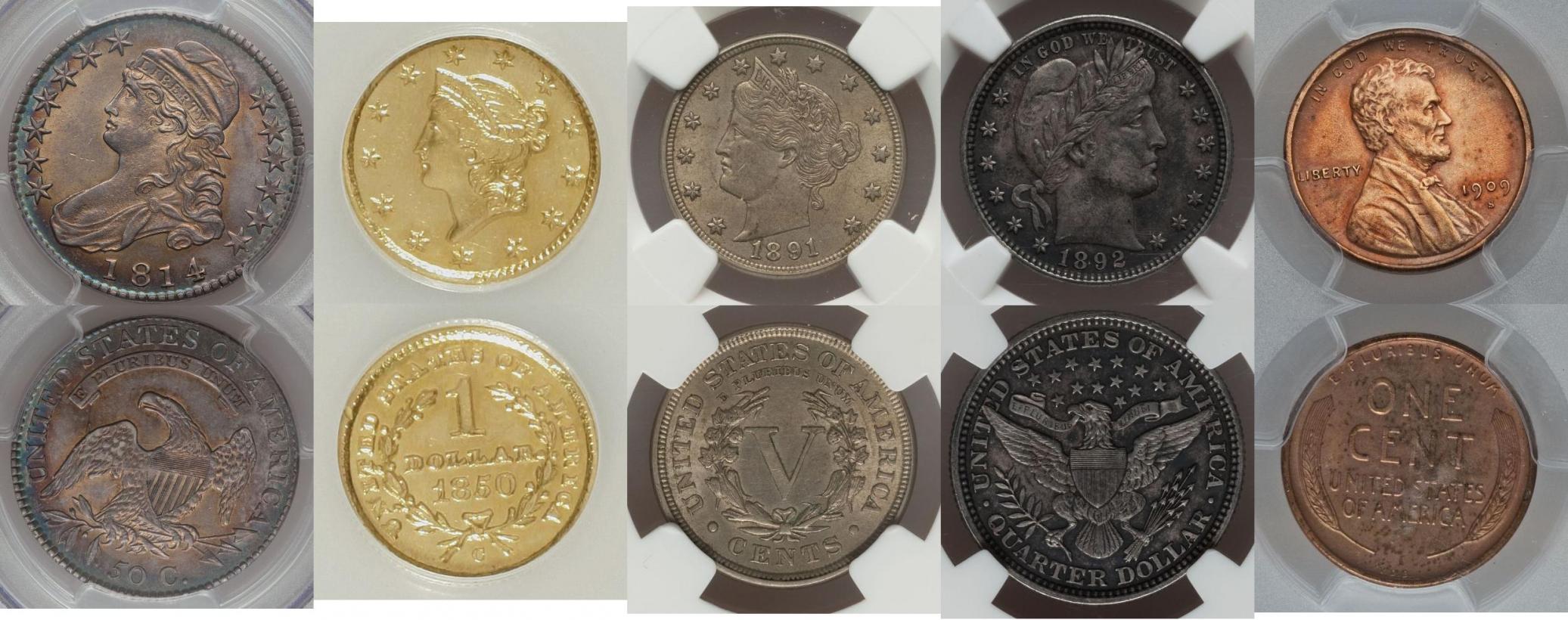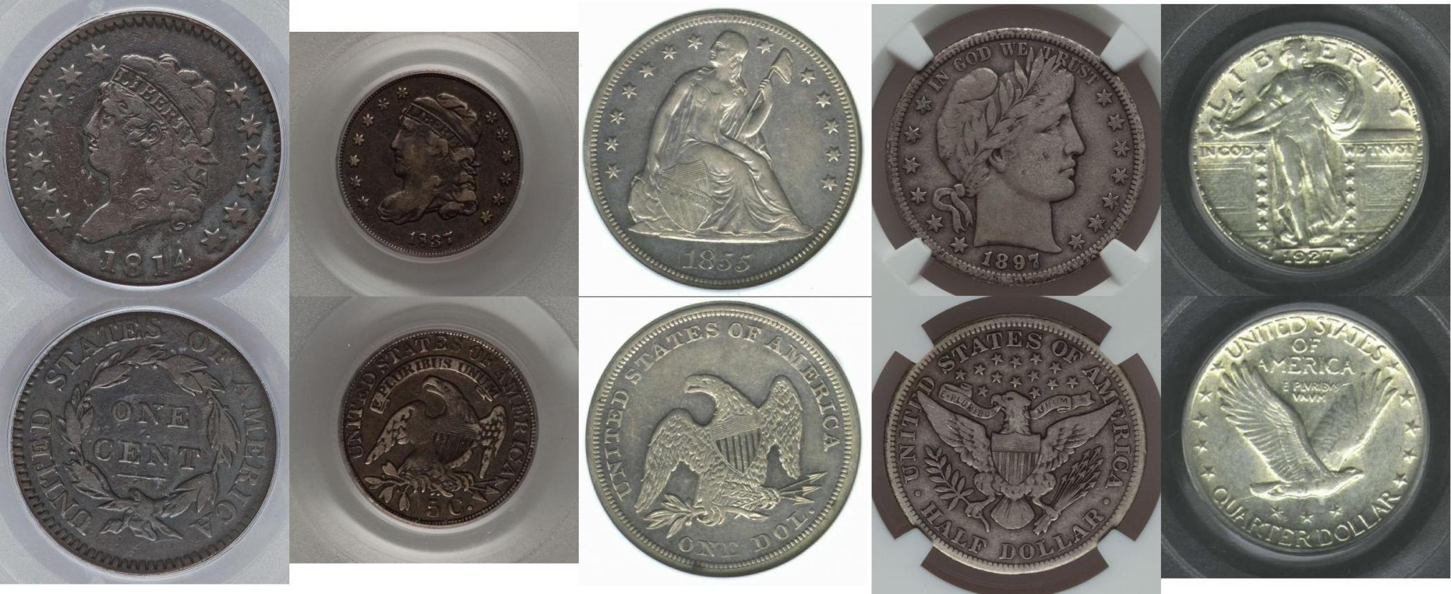 The Very Belated 500[SUP]th[/SUP] Post Contest Hi Coin Talkers! My name is Michael and I am a coin collector. Many of you might not know me as I have only recently started to post more than I lurk. I have won some pretty awesome prizes from some very generous members through CT Contests. In addition to this, I have gained something I prize more than the coins and that is knowledge. I know I don’t know much compared to many members on this site. But what I do know is that my knowledge of coins has been increased many times over due to the great resource that is Coin Talk. Because of this, more than anything, I wanted to try and give back to this online community that has helped me so much in my development as a collector. As you can see by the title, this contest was supposed to happen quite a while ago. It has taken me some time to get everything sorted out, the prizes selected, the details hashed out, etc. For the delay in this, I am sorry; but enough of that. Contest Info The contest is simple. It is basically a US coin quiz that covers US coin history, the US Mint, coin grading, problem coins, varieties and some historically significant coins. The details/rules/requirements are outlined below: -100 post minimum to enter, US mailing addresses only. -Contest submissions are due by April 1, 2013 at 9PM ET. -Submit your answers via PM and try to be concise. I will post the answers and winners within a day or two. -Three (3) “main” prizes will be awarded to the top 3 scores (ties broken with tie-breaker questions) -Then, three (3) “draw” prizes awarded by random drawing, converting points to entries (half points rounded up) -Draw prize entries will be sorted alphabetically by screen name and assigned a number based on order in list. -Three unique numbers will be generated via random.org and matched to the entry number. -First winner of drawing will select a prize first, followed by the second, then third. -The three winners of the Quiz Prizes are excluded from the random drawing. -Only one random draw prize per person. If necessary, additional numbers will be generated to provide for this. “Main” Prizes 1st place: 6-Coin Early 20[SUP]th[/SUP] Century Type Set in Whitman Holder (Cent-Dollar, varying grades, G-VF+) 2nd place: 1922 Peace Dollar in 2x2 (AU, Chatty) 3rd place: 1996-W Roosevelt Dime Uncirculated in 2x2 “Draw” Prizes (Winner’s choice) -1986-S Statue of Liberty Clad Half Dollar Gem Proof in Generic Slab -1973 P+D Eisenhower Dollars Uncirculated in 2x2s -1982 7-coin variety pack in cello (uncirculated, but off quality) and 3 IHC, 1 V Nickel (circulated in 2x2s) Any questions can be asked either in thread or via PM. I’ll try to log in a couple of times a day to answer any questions. Just remember, don’t post your answers in the thread. Good luck to all!! ---------------------------------------------------------------------------------------------------------------------------------------- US Coinage Questions (1pt each) 1. What is the only foreign city to have a US mint branch? 2. What do arrows next to a coin’s date mean? 3. What are the carved pieces made from Buffalo nickels known as? 4. What coin provided the reverse design of the Franklin half dollar? 5. What is the shortest (duration) circulating, non-commemorative coin series? 6. What was the first coin to have a West Point (W) mint mark? 7. What denomination has been minted at all US-based mint locations? 8. Which coin first showed a living US president? 9. What is the smallest non-gold coin minted (by diameter)? 10. What non-coin item was later added to the King of Siam presentation set? Guess the Grade Part I Guess the assigned grade of these uncirculated coins (1 pt for correct answer, 0.5 pt for ± 1 grading point) Ex: If answer is MS-63, 1 point will be awarded for MS-63 and 1/2 pt for MS-62 and MS-64 Note: No problem coins are shown and no designations need be given. 11. 1884-CC $1 Morgan PCGS (PL) 12. 1892-CC $10 Liberty Head NGC 13. 1920-D 5c Buffalo PCGS 14. 1921 10c Mercury NGC 15. 1937 1c Lincoln Wheat NGC (RB) Guess the Grade Part II Guess the grade of these circulated coins (1 pt for correct answer, 0.5 pt for ± one grade step) Ex: If answer is F-15, 1 point will be awarded for F-15 and 1/2 pt for F-12 and VF-20 Note: No problem coins are shown and no designations need be given 16. 1814 1c Classic Head PCGS 17. 1837 H10c Capped Bust PCGS 18. 1855 $1 Seated Liberty NGC 19. 1897-S 50c Barber NGC 20. 1927-S 25c Standing Liberty PCGS Guess the Variety What well-known variety is shown in the picture? (1pt each) Ex: 1942/1 Mercury Dime Overdate Note: No FS, Wexlar, etc. numbers are needed, just the common name and type 21. 1937-D 5c Buffalo 22. 1955 1c Lincoln Wheat 23. 1961 50c Franklin (PF) 24. 2004-D 25c State Quarter 25. 2008-W $1 Silver Eagle Guess the Problem What single problem designation did these coins receive? (1pt each) Note: Possibilities-Cleaned, Environmental Damage, Ex-Jewelry, Corrosion, Stained, Whizzed, Plugged, Scratched, Re-Engraved, Questionable Color. Each coin only has one problem and all coins answers are different. 26. 1814 Capped Bust 50c PCGS 27. 1850-C Liberty Head Type 1 Gold $1 NGC 28. 1891 Liberty 5c NGC 29. 1892 Barber 25c NGC 30. 1909-S VDB 1c Lincoln Wheat PCGS Coin Rarity Order these coins from least rare to most rare. (1pt for each correct placement) 31. 1913 Liberty Nickel 32. 1909-S VDB Lincoln Cent 33. 1964-D Peace Dollar 34. 1894-S Barber Dime 35. 1893-S Morgan Dollar Tie-Breaker Questions 36. How many Morgan dollars do I own? 37. How many Peace dollars do I own?