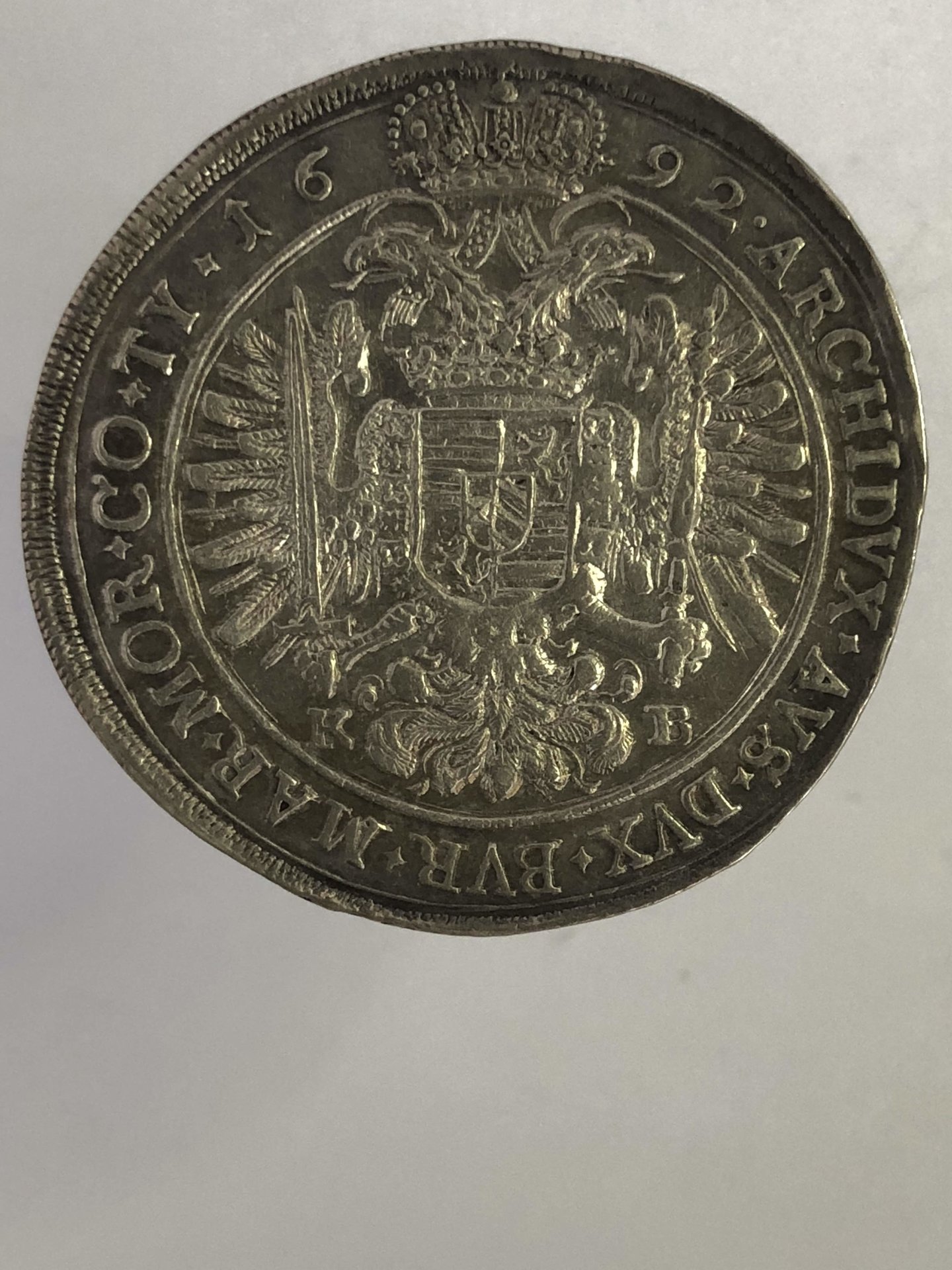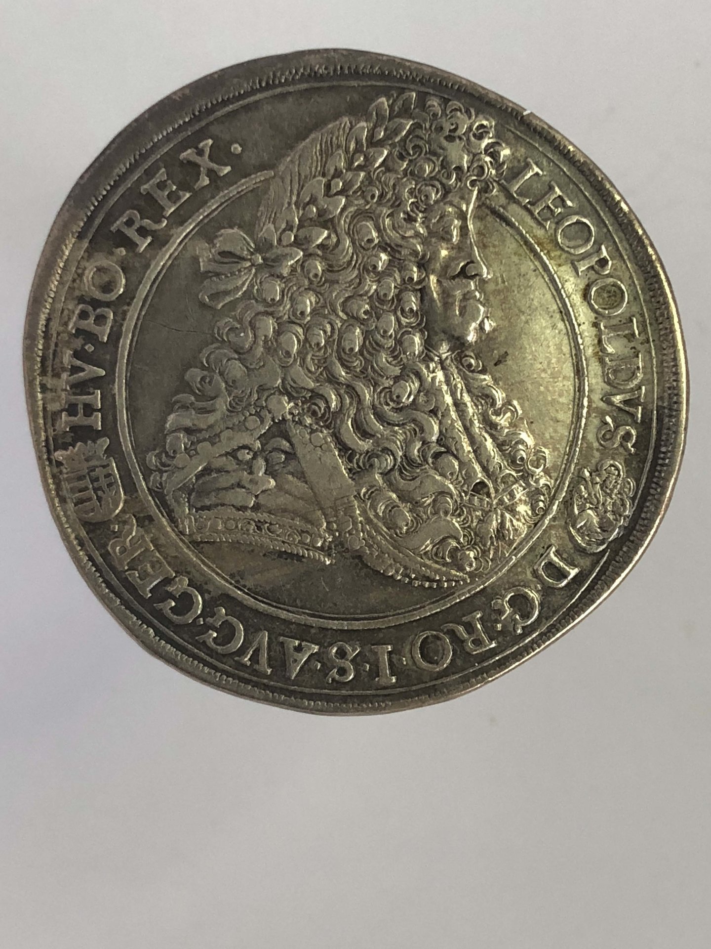 Here he doesn't look so ugly - I think: AR Thaler 1692, K B = Körmöcbánya (Kremnitz) mint, 46 mm, 28.64 g Ref: Davenport 3262; KM 214.3; Huszar 1372; Obverse: LEOPOLDVS D • G • RO • I • S • AVG • GER • HV • BO • REX •, laureate, and armored bust right with lion shoulder, titles divided by small Hungarian coat of arms and Madonna with Child Reverse: • ARCHIDVX • AVS • DVX • BVR • MAR • MOR • CO • TY • 16 92, crowned Imperial double eagle holding scepter and sword, Hungary-Bohemia coat-of-arms within Order Chain on breast, K B across fields