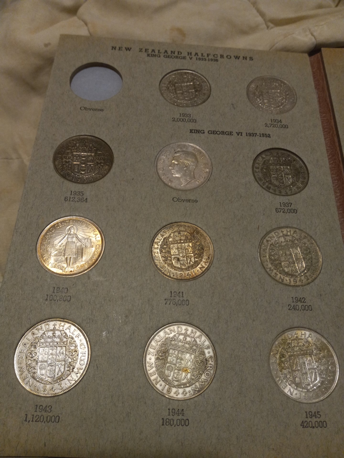 Here is the inside of the album. The 1948 came with it so all the other coins were transferred from my Bertrand folder. The Bertrand folder is in such bad shape I tossed it wasn't even worth giving away. This folder is listed in Thomas Moll's book Guide to Vintage Coin Folders and Albums. There is also a Shilling/Florin version but I've never seen that one for sale. For that folder I cut apart an Australian Florin and Shilling folders and taped them together. I then put stickers over the dates and wrote the New Zealand dates on them.