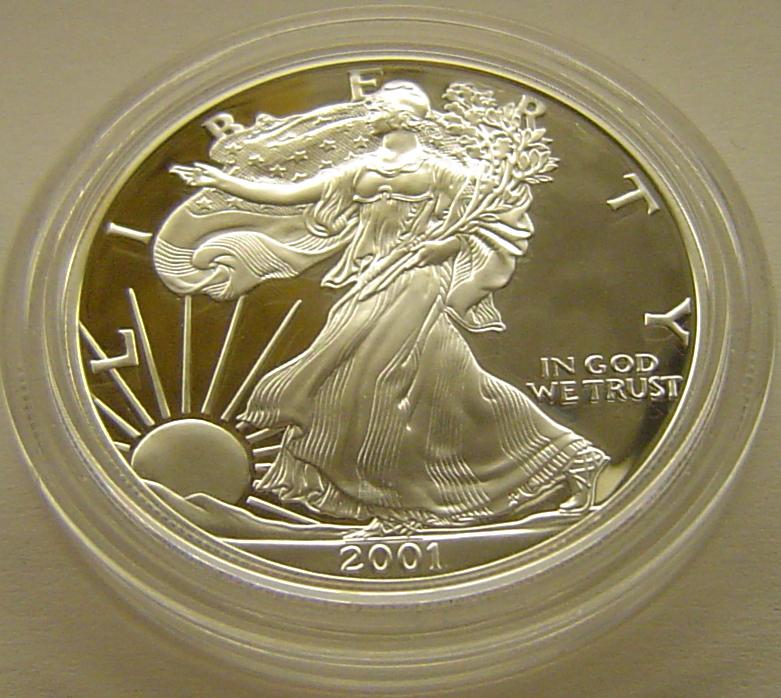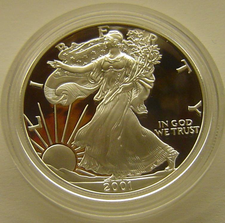 I can understand what you are saying BustCoinageDude. Here is my 2001 - Westpoint Mint Silver Eagle Proof. I have it with the fancy original case and all that it comes with from the mint. Beautiful coin, my favorite Silver Eagle. I haven't been able to find the mintage anywhere in my Krause books however..... I hope the pics are okay, the first photo of the obverse, and the first photo of the reverse I am posting are slightly discolored, the photo that is, not the coin.... my camera does that sometimes.