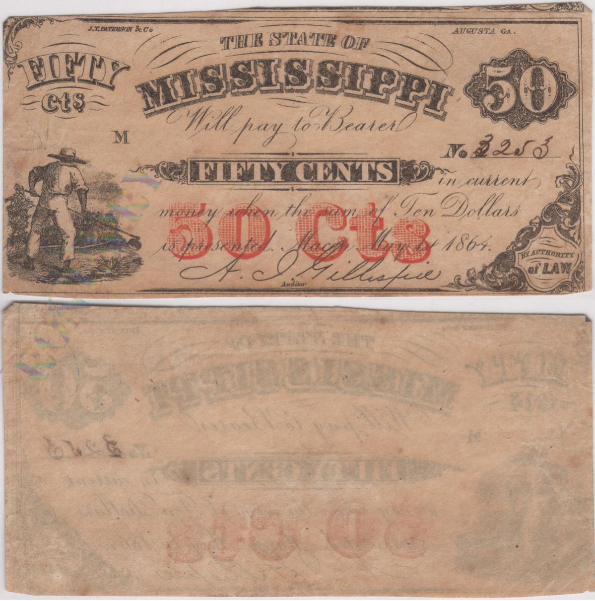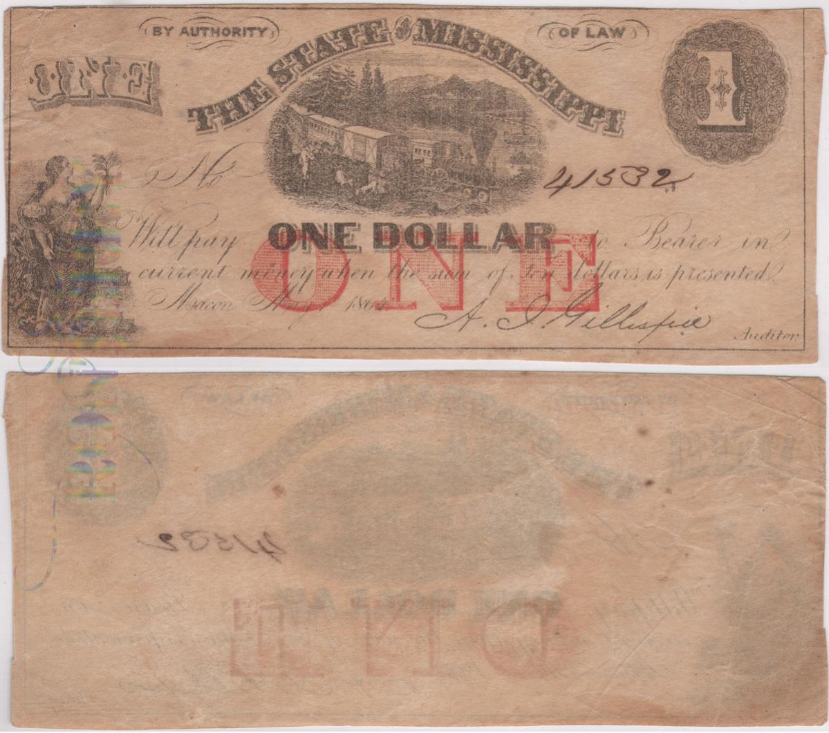 Criswell #44($1 Mississippi May 1, 1864) & #45(50C Mississippi May 1, 1864) Did these notes come with printed signatures(A. I. Gillespie), and hand signed serial numbers? Everything looks good under mag. The Red stamps looks like they are wax based or similar, and is the top layer. The SN# looks aged/burned-in, and the paper feels light, similar to onion paper. The only thing that seems out of order is the Auditor signature. Looks printed, but I'm not sure it that was common for the series?