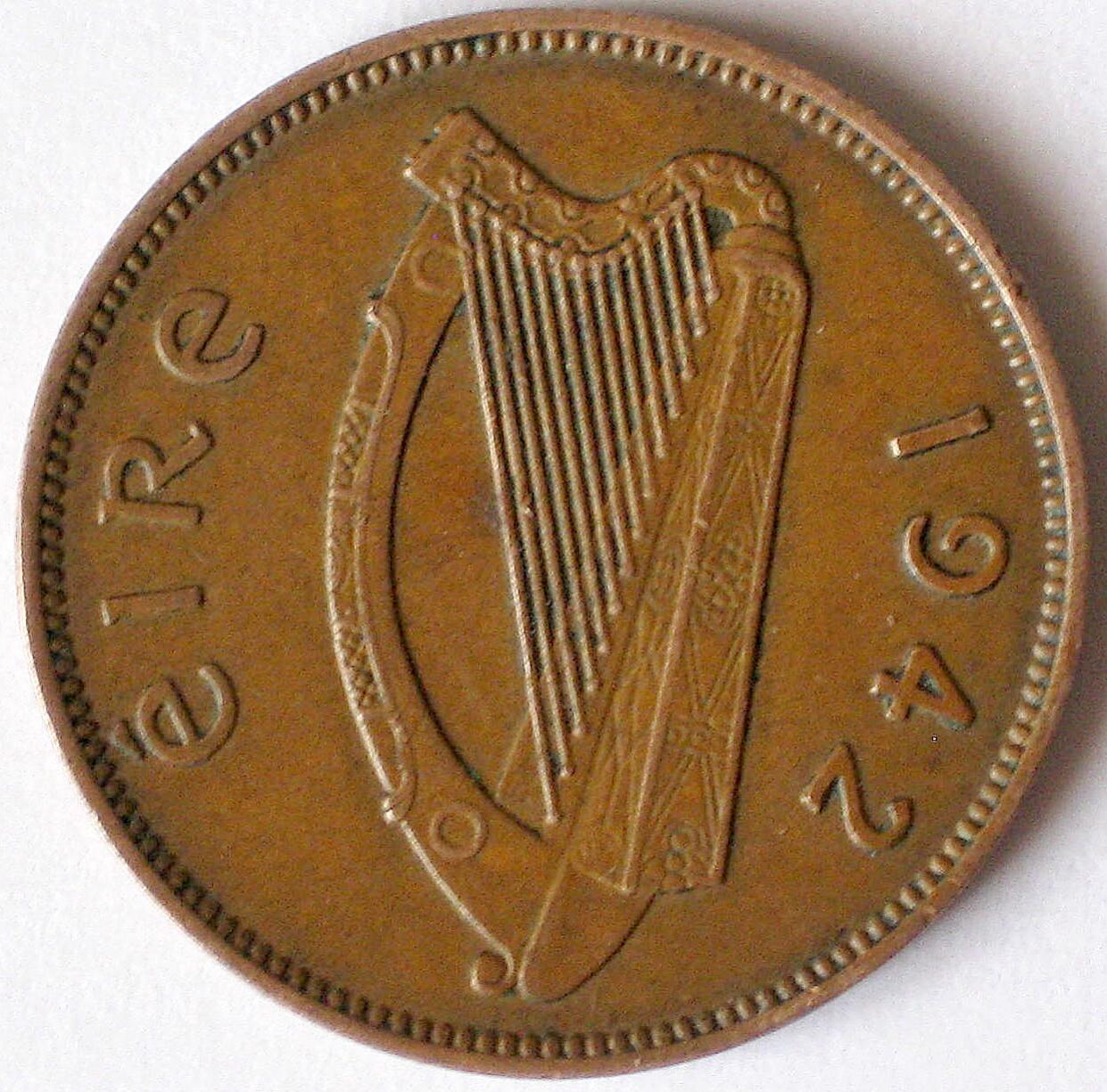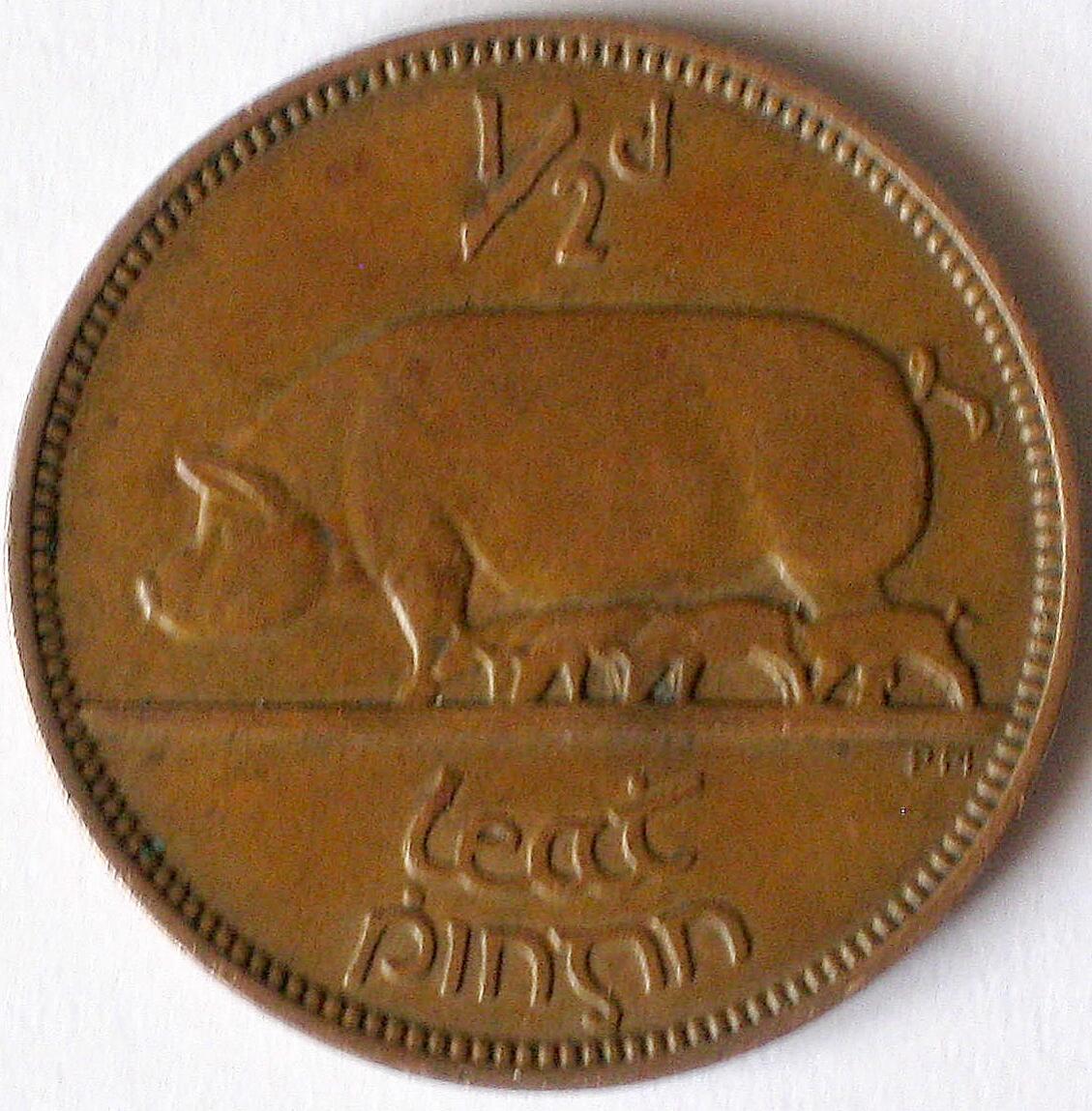 See below - unfortunately still a little too large to be an emoticon. Some more info about the coin: That halfpenny was minted between 1939 and 1967 (basically the same design was used on the Irish Free State coins 1928-1937 by the way). The 1942 issue is the most common year, with about 6.9 million pieces minted. Value is less than a dollar, I think, but those animal designs - they also had chicken, salmon, etc. - I like a lot ... Christian