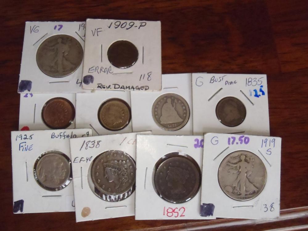 Well I just got back from a coin auctions the prices were normal just as I thought Morgans went for nothing below 37.50. I picked up a few I thought were nice. Let me know what you think about the indian head. Also I got a 1909 wheat with most of the rev gone. Just the ears are showing, niot sure if its grease in the die or post mint. If you look around the edge you will see markings of some sort of tooling. I didnt pay much so if it's nothing then its OK. Here is a list of what I got 1838 LC, 1852 LC, 1863 Indian, 1905 Indian, 1909 Cent, 1925 Buff, 1835 10C bust, 1877 CC 25C, 1919 D & 1929D Walkers All for around 100