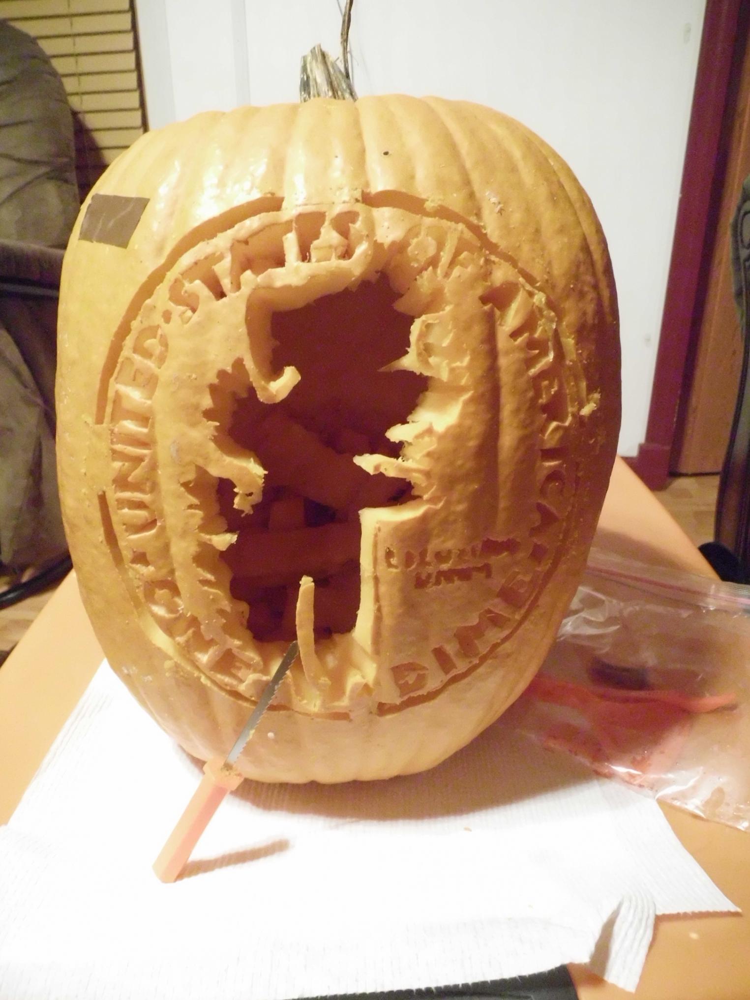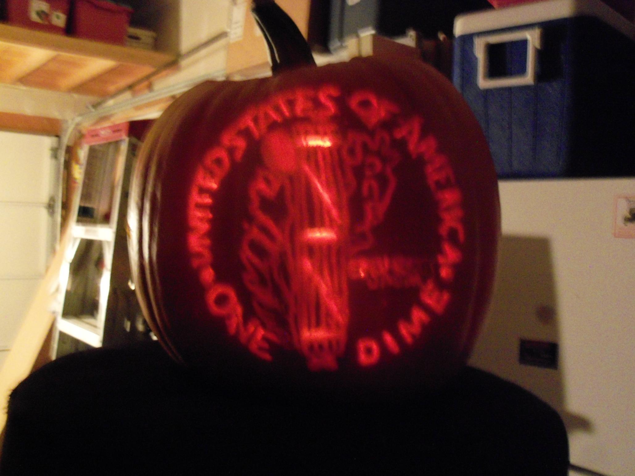 This Year's Post Garden Damage So guys, I just finished up this year's coin pumpkin. It's not nearly as good as last years but I wanted a challenge and, well, I got one. After an hour of cleaning it out and tracing the design onto it, and four hours of careful carving, here's this years masterpiece: the reverse of a Mercury Dime. I could not for the life of me figure out a way to get the intricate details into it, but I hope you enjoy it. I will try to get some better pics up tomorrow when I can get it outside in different lighting. Happy Halloween everybody!