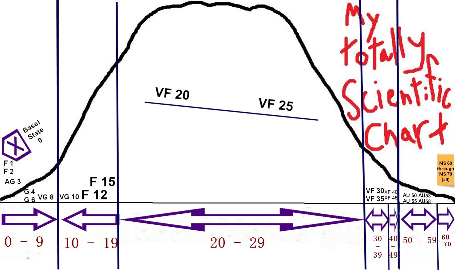 I was thinking about this this morning and may have found a way for me to keep track of how the Sheldon scale works. So, basically the scale is divided into 7 groups: (theoretical groupings of about 10 points each, although the ones below 60 don't use all their numbers) 1) Uncirculated (no wear) = MS 60-70 --------------------------------------- SEPARATION POINT FOR WEAR THAT AFFECTS THE HIGH POINTS OF THE DESIGN 2) Evidence of wear only on the highest points of the design, and no where else on the coin. This is generally interpreted as no parts of the coin being "flattened" by wear = MS 50-59 3) The wear becomes visible as flattened areas of the high points of the design (as opposed to simply evidence of the first bit of wear on the coin), but all the features are clear and sharp (as far as the original strike goes) = MS 40-49. This is a very demanding grading section, as the wear that is neccessary to keep it just below AU is slight, and any more that affects more of the finer details then puts it in a lower grade. --------------------------------------- SEPARATION POINT FOR WEAR THAT AFFECTS THE FINER DETAILS 4) There is some light wear on the coin in addition to high points flattened, but details are still sharp and all lettering is present with only the minor finer features are affected by wear = 30-39 --------------------------------------- SEPARATION POINT FOR WEAR THAT AFFECTS THE MAJOR DETAILS 5) Light to moderate wear over the entire coin and major details start to be affected by the wear = 20-29. Some call this the point of good, honest wear on the coin, with attractive detail still present. 6) Moderate to heavy even wear on the coin, where the details are going or gone in some places = 10-19. The design (major componts) are clear and bold still. --------------------------------------- SEPARATION POINT FOR WEAR THAT AFFECTS THE RECOGNITION OF THE DESIGN 7) Heavy wear, so that the design has become weak = 0-9. At the lower point of this, the coin may be barely recognisable as to type and date or without a full rim, and at the higher end it still retains some details of the coin even though the entire design is practically flattened. In those seven groupings, only the Uncirculated coins use all the numbers available (eleven of them, from 60 through 70), and most of the lower ones use anywhere from only two to about 4 numbers: 50/53/55/58, 40/45, 30/35, 20/25, 10/12/15, and 3/4/6/8. Since the higher numbers (5 and up) on each of the grouping are given to coins with good "eye appeal", they are pretty much reserved for coins that have few hairlines, and only a few minor scuffs or marks. The lower grades (0-4) are used a lot for coins either just making it into the grouping, or those that have a number of marks, dings, and the like, that make them visually unattractive. This is why many collectors would rather have a really great looking AU58 than a MS 60-63. And a coin that rated a MS61, for example, will, with wear, NOT step down to an AU-58, but rather will probably be classed as an AU50 - because not only wear, but also bagmarks and unattractiveness of hairlines, scratches, etc will factor into the grade. Of all those groupings, I am inclined to say that at VF30 or anything above that, the coin's wear points will be slight in order to change the grading of the coin. In other words, not too much handling or friction from the coin moving against other surfaces, will significantly impact the grading points. Whereas at VF25 and below, it would take more handling or surface friction to cause the loss of details or original surfaces enough to get it into a lower grade. Well, this is a start for me to easily understand the grading system and be able to incorporate it into what I am seeing. I don't know about others, but sometimes it takes me being able to put this into a framework I am understanding to be able to easily access this in my head. I'm sure that grading doesn't come easy to everyone. If this helps someone else, I will be pleased. And if I am interpreting this wrongly, please jump in and flog me with the (virtual and proverbial) wet noodle. But if you do that, make sure you make the corrections that you think neccessary. Thanks.
