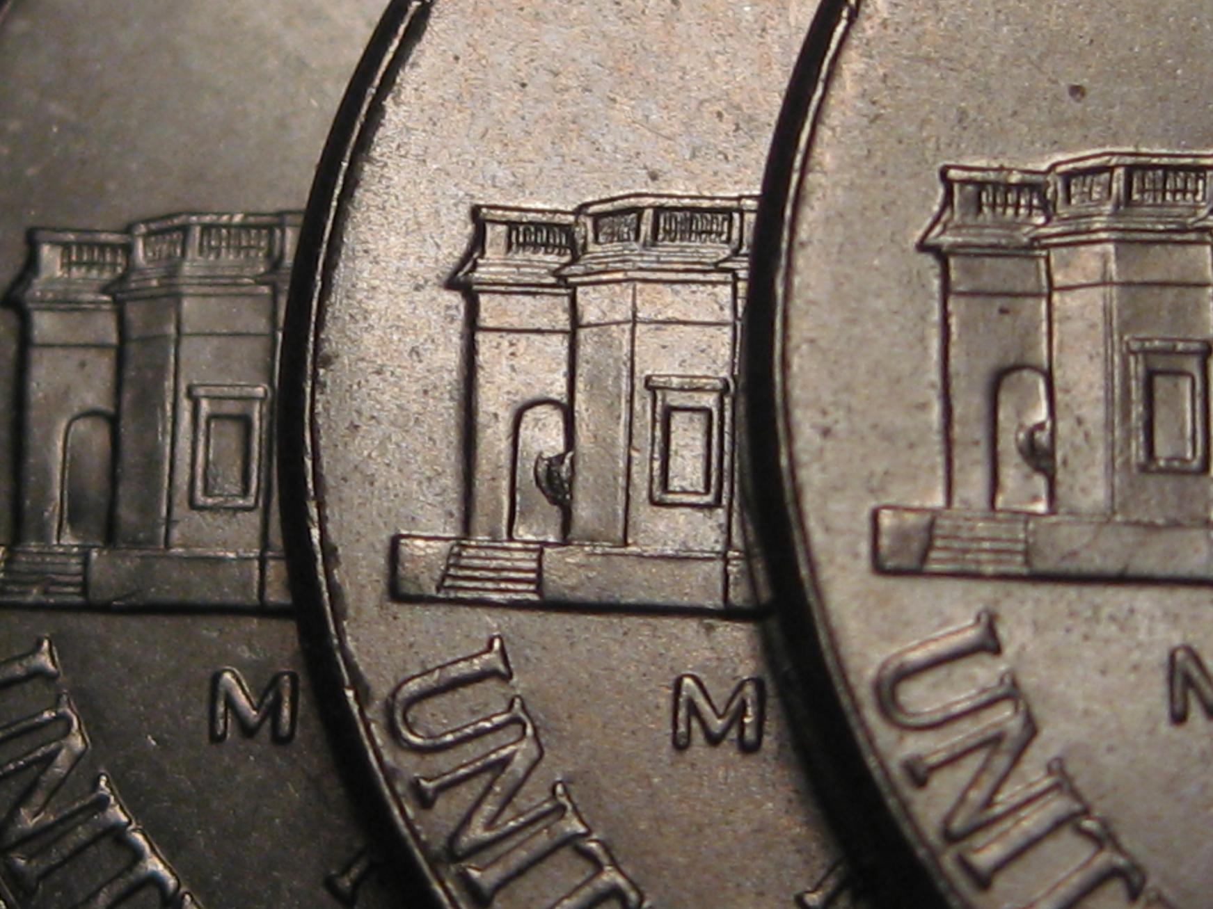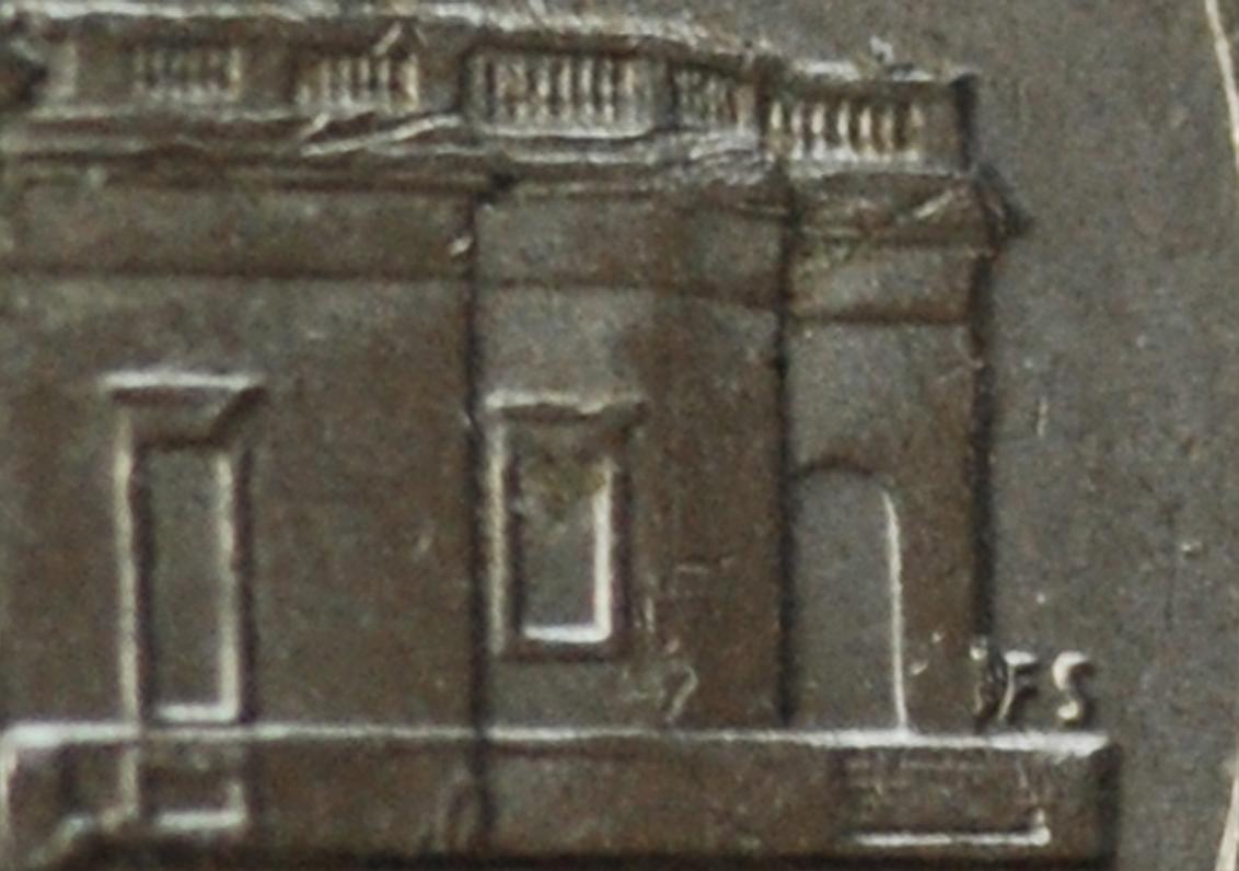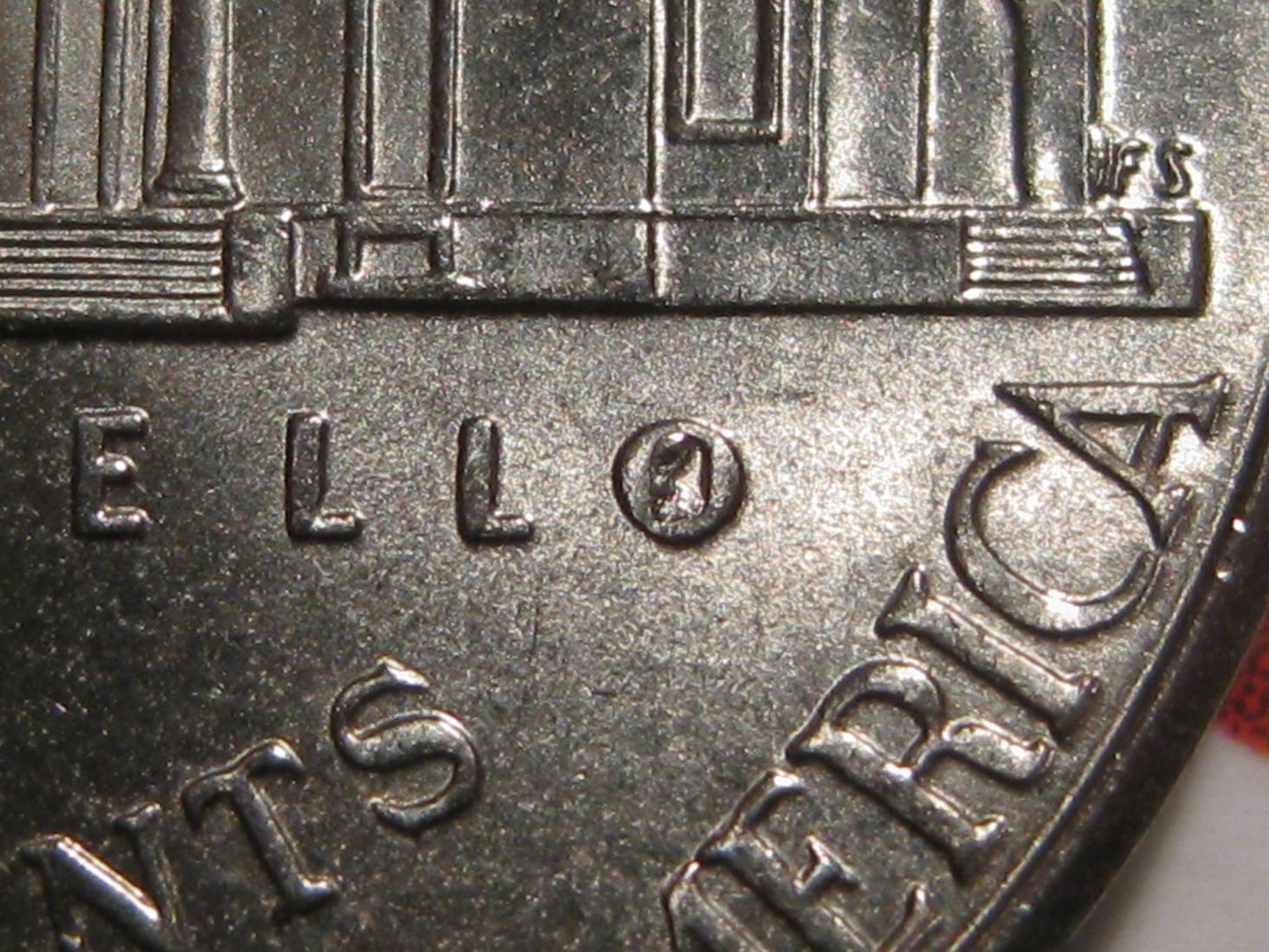 Hi found some interesting nickels i could use some help with. Let me know what you think. These three nickels i am displaying are all 2012 with a (P) Mint Mark. When looking through some pocket change i found one nickel with what i thought was a die gouge in the first window on the reverse side of the Monticello building. As i continued to search i noticed one with an identical mark in the exact same spot. I then noticed they have the same date and mint mark. As i looked in further they had other identical characteristic. Which leads me to ask if this is one really weird coincidence or possibly something else. I'm new to coin errors and still learning so I know I most likely have nothing. Thanks to everyone for your help. Picture #1. The first Nickel is of a regular 2012 (P) Nickel followed by the two that i mentioned above with a mark in the first window. Picture #2. One of the Nickels with the mark has this on the (T) in Cents Picture #3. On the obverse both Nickels have the same mark in (E) in Liberty Picture #4. Both of them have a weird (FS) next to the Monticello Building Picture #5. This is another Nickel that i found. This one doesn't have the mark in the window but it has a (FS) as displayed in picture #4 also.