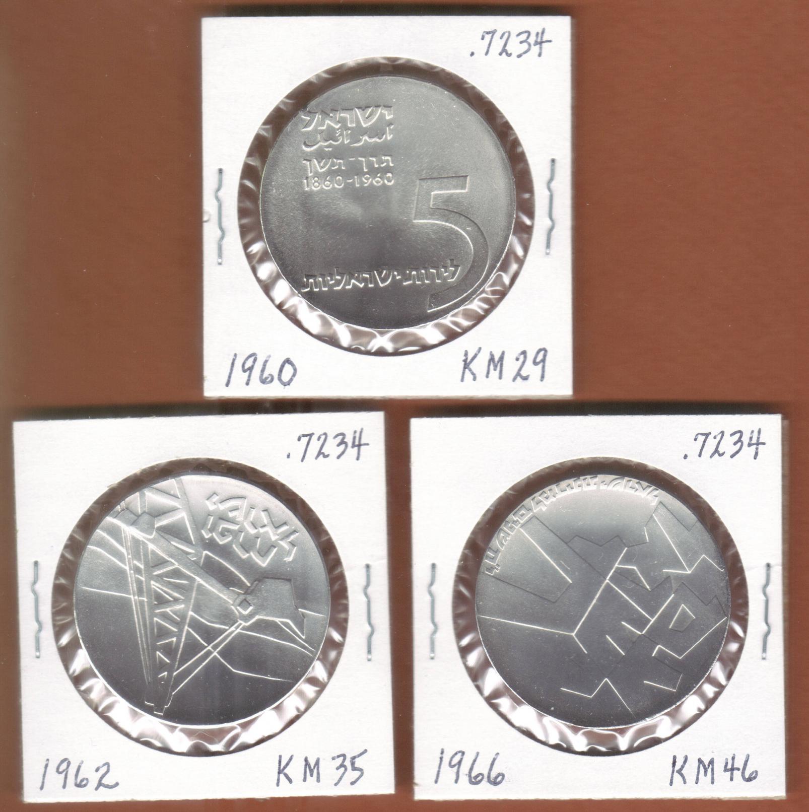 For sale, three Israel silver crowns, 1960-1962-1966. As I am not familiar with Israel coins, I don't know if these are Proofs or just really nice Uncirculateds -- they are priced as if they are BU. The three coins contain a total of 2.21 Troy ounces of silver, and in Krause, they are cataloged as KM29, KM35, and KM46. Spot price for silver would total $62.08 on August 10. Price, $75 postpaid and insured. PayPal or money order. Shipped ONLY in the United States. All sales final.