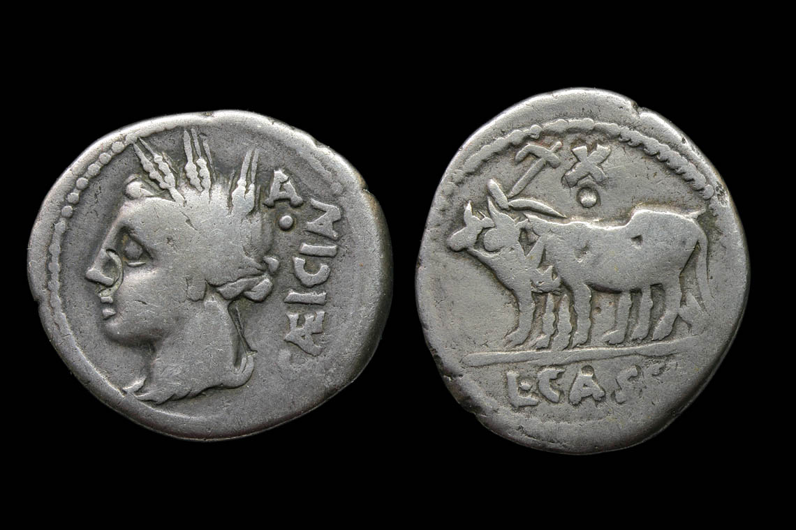 I agree that oxen usually means a colony but my dead tree resources fail me here. The best answer I find is online: http://www.flickr.com/photos/ahala_rome/4809090272/in/set-72157615194900812 where we learn that the moneyer is otherwise unknown to history. He mentions doubting the theory that the moneyer refers to a Cassius who founded a colony in Campania. I do not have Echkel or Havercamp to follow up on their arguments. The books to support collecting a 3 gram coin weigh more like three kilos.