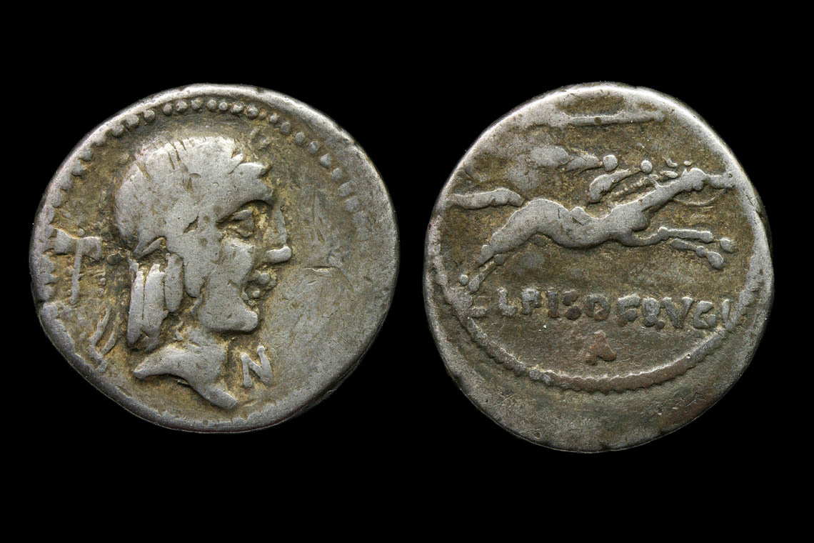 I finally finished the photos from the show Friday. I know many of you might prefer one very nice coin or 100 uncleaned for the same money but I felt good adding three low to middle grade denarii. One you all should know from Chris' recent post but mine is not as nice. C. Postumius. 73 BC. AR Denarius (3.94 g, 5h). Draped bust of Diana right, with bow and quiver over shoulder / Hound advancing right; spear below. Crawford 394/1a; Postumia 9. F+, a bit porous and banker's mark on cheek. L. Cassius Caecianus. 102 BC AR Denarius (3.76g, 3h) Head of Ceres left control mark dotted A / 2 oxen control dotted X Crawford 321/1; Cassia 4; VG banker's marks - worn but sound metal. I have seen this less often than some but do wish the reverse had a bit less wear on the ox heads. C. Calpurnius Piso. 90 BC AR Denarius (3.91g, 3h) Head of Apollo right control mark double axe, N under chin / Horseman running right with palm, spear above, dot A below; Calpurnia 11; aF uneven tone The last is one of the most common Republican denarii. I already had three with different marks but a complete set of these would be too heavy to list all at once. It was appropriately cheap (less than half the others). I sometimes give in to buying things my collection really didn't need. I think the axe was what made it appealing. My other one has a Roman numeral there so this really is not a duplicate and I guess I needed it after all. The page: http://www.forumancientcoins.com/dougsmith/acmfrugi.html The other things from the show are late Roman bronzes but they will wait for another day. It is late here. I ended up shooting a couple coins three times before I accepted the results. It is hard when the goal is to make a poor coin look like a $300 one.
