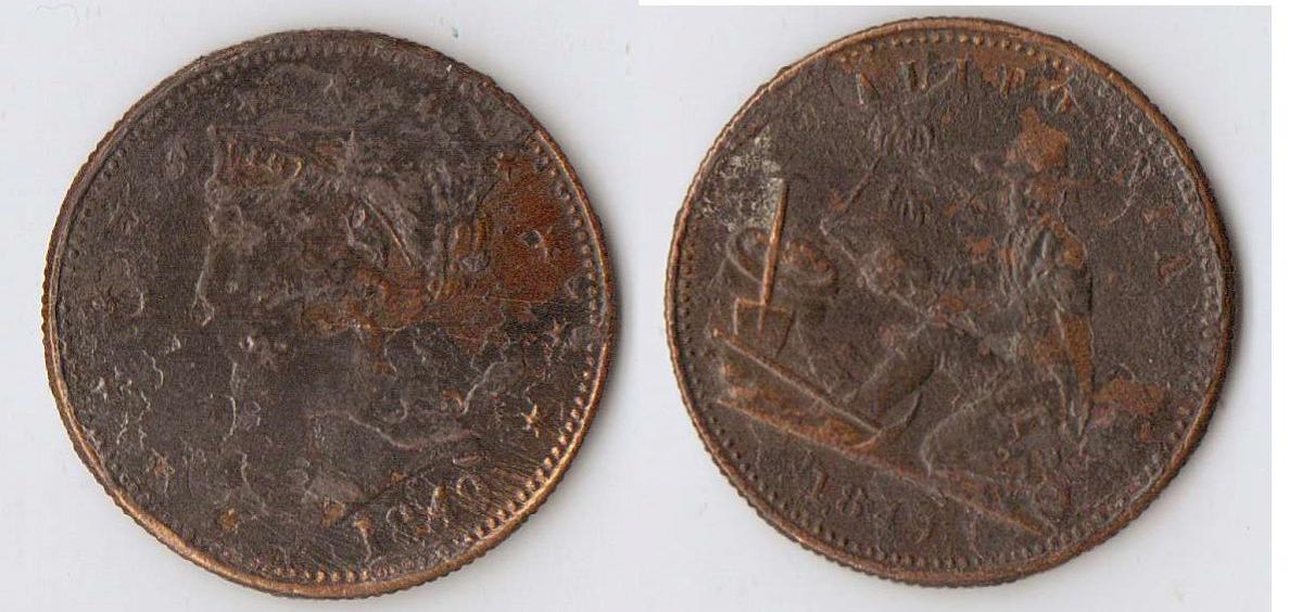 I'm looking for any info on these tokens. I call them tokens but I don't know for sure. The first says 1849 on one side with a liberty bust. The reverse says "California 1849" and has a picture of a gold miner. Both sides have this black stuff on them that I can't figure out if it's part of the coin or something someone added later. The second is in the best shape. One side has a picture of a woman with the word "Dodd" on her head. That side says Cincinatti 144 Main St. The reverse says Dodd & Co. Hatters Cincinnati. The third looks like a 1840s-era large cent on the obverse. I can't make out any writing on this side. Both sides are this gold color. Again I don't know if this is original or something someone added later. On the reverse I can make out the words "(something) Spiel Marke" on the bottom and on the top "Unitate (hole) Ortitudo (fortitude?) These were 25 cents apiece so don't feel bad if they're just junk. I thought it was worth taking a chance.