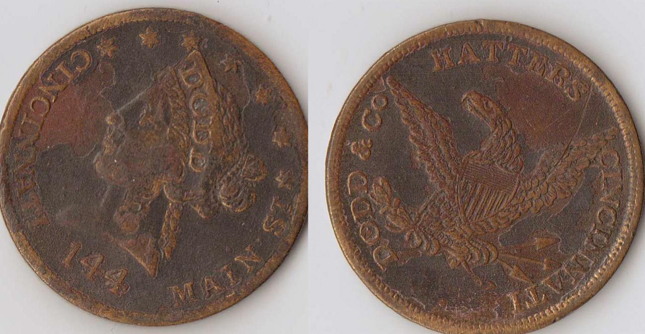 Here's an eBay listing of your second token. http://www.ebay.com/itm/Dodd-Co-Hatters-Cincinnati-Eagle-/380353259531 By the way, the third token is modeled after the Liberty Coronet $20 gold piece