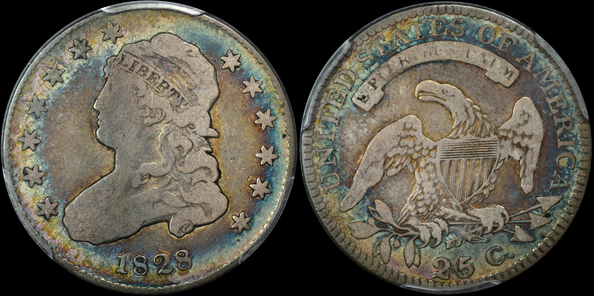 Since I don't want to be the last poster in this thread I'll do another. Here is an 1828 Quarter PCGS F12 sent to CAC 7/5/2014. "Wha' happen Lucy?" jom