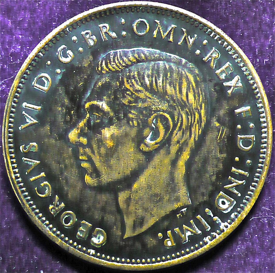 1948 English George VI penny: glued reverse "I also have a couple older British pennies that were sloppily glued into an album at one time, and still bear the remnants of that adhesive caked on the reverse...great experimental material which, even if completely destroyed in the process (not likely) would be a zero loss." Quoted meself, there...hope that's OK. Pics above are one of the two pennies mentioned, after a 4 hour soak in a pretty stiff caustic (sodium hydroxide) bath: no effect apparent on the transparent goop obscuring the reverse. The colors are pretty accurate, the reverse being nearly black. Denatured alcohol will be next, and only long enough to see if softening or other evidence of possible success appears. Acetone follows, if there's no discernible improvement. At that point I'll post another reverse pic, and be thinking out loud about what will follow. Heat is another tool; combined with immersion in a bit of bee's wax, 165F for an hour or so might break the bond 'twixt goop and copper. I'd like that. For the record, current weight is 9.4gm