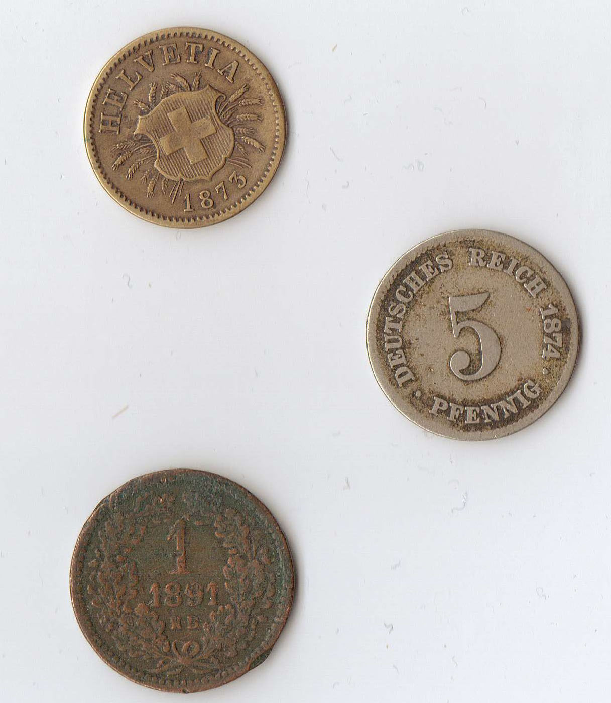 In this group I have a silver 1870 Spanish peseta, an unknown Arabic looking coin I'd like some help identifying that I thought might be silver, and an 1874 German 5 pfennig, 1873 Swiss 5 rappen and an 1891 Hungarian 1 (I'm not sure what the unit of currency is). I found five or six similar Hungarian coins from the late 1800s/early 1900s.
