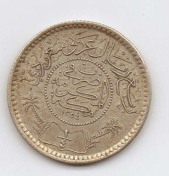 The Arabian coin is a silver 1/4 rial from Saudi Arabia dated AH 1354 (1935 in the Christian calendar). http://cgi.ebay.com/1935-AH-1354-Saudi-Arabia-1-4-Riyal-Silver-coin-UNC-/220767360440