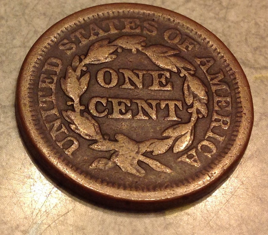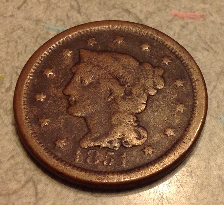 Bought this from a young man who answered my ad in a small local greensheet. I'm hoping he will report good things to his aunt and I can buy even better coins. There have been 3 error coins in the grandfathers collection and I know there are gold coins. I'm drawn to large cents and this is my first one.