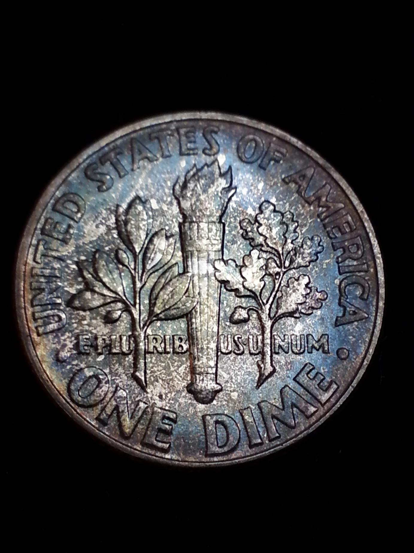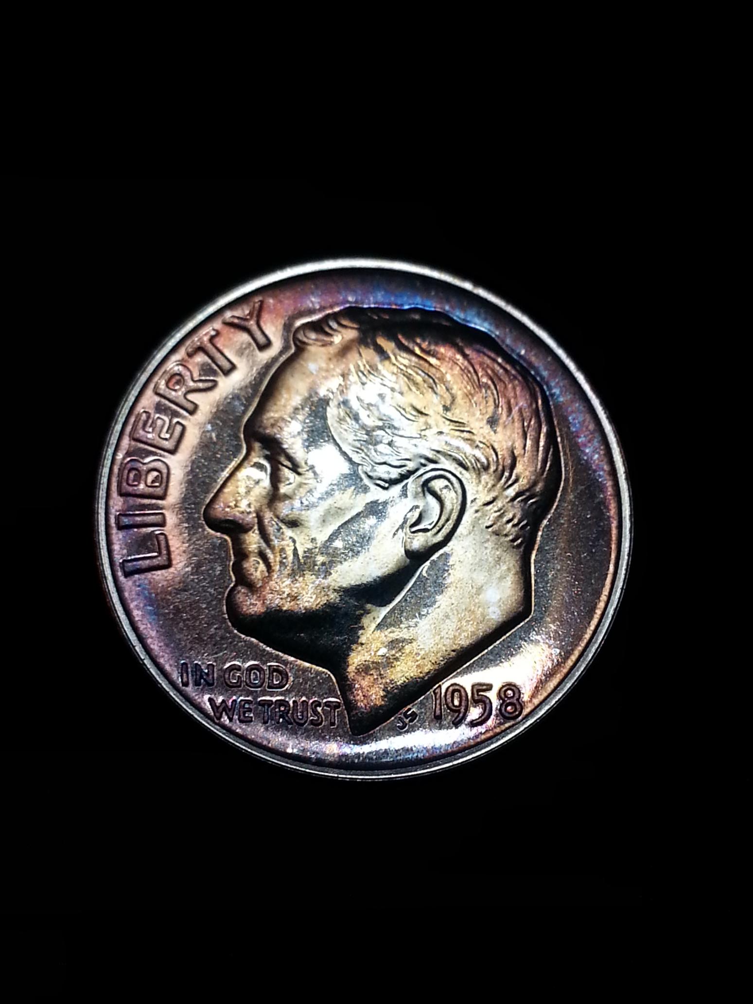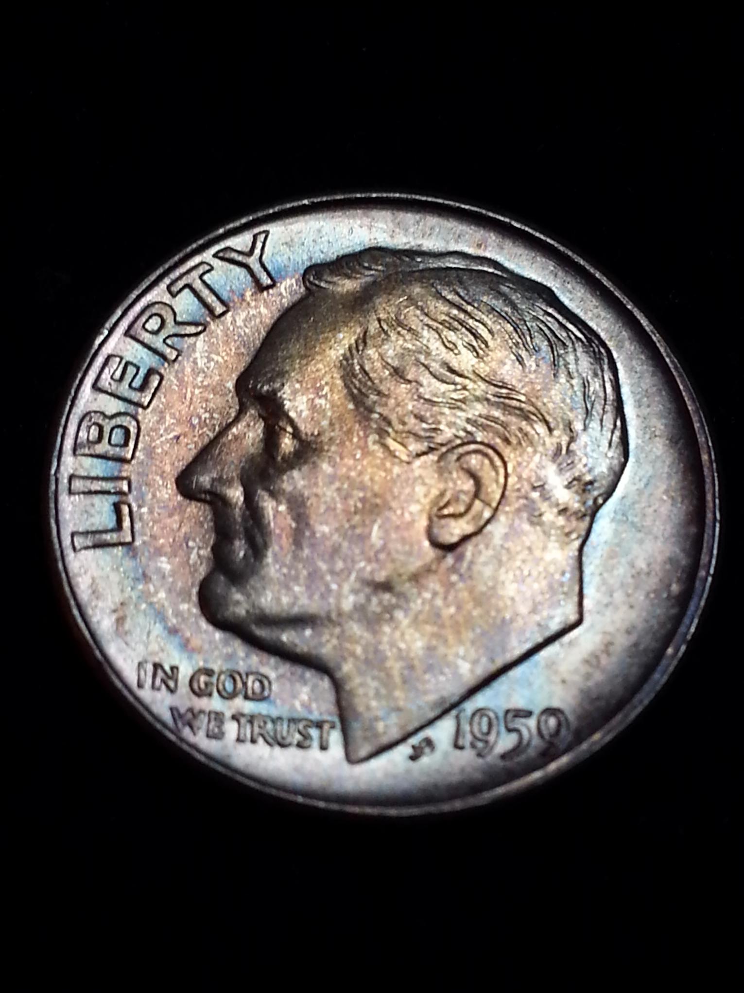 I love toned silver Roosies and I think they're beautiful. The 58 is a proof and would probably be a 66 or 67. The 59 has the classic mint set blue toning. It has a lot of rim dings, and I dont know if I'm seeing wear on the high points on the obverse or not. It could just be the pics. If it is fresh from a mint set its probably a 63-64. But I think it might have been around town once or twice.. its probably a 58. I like both though!