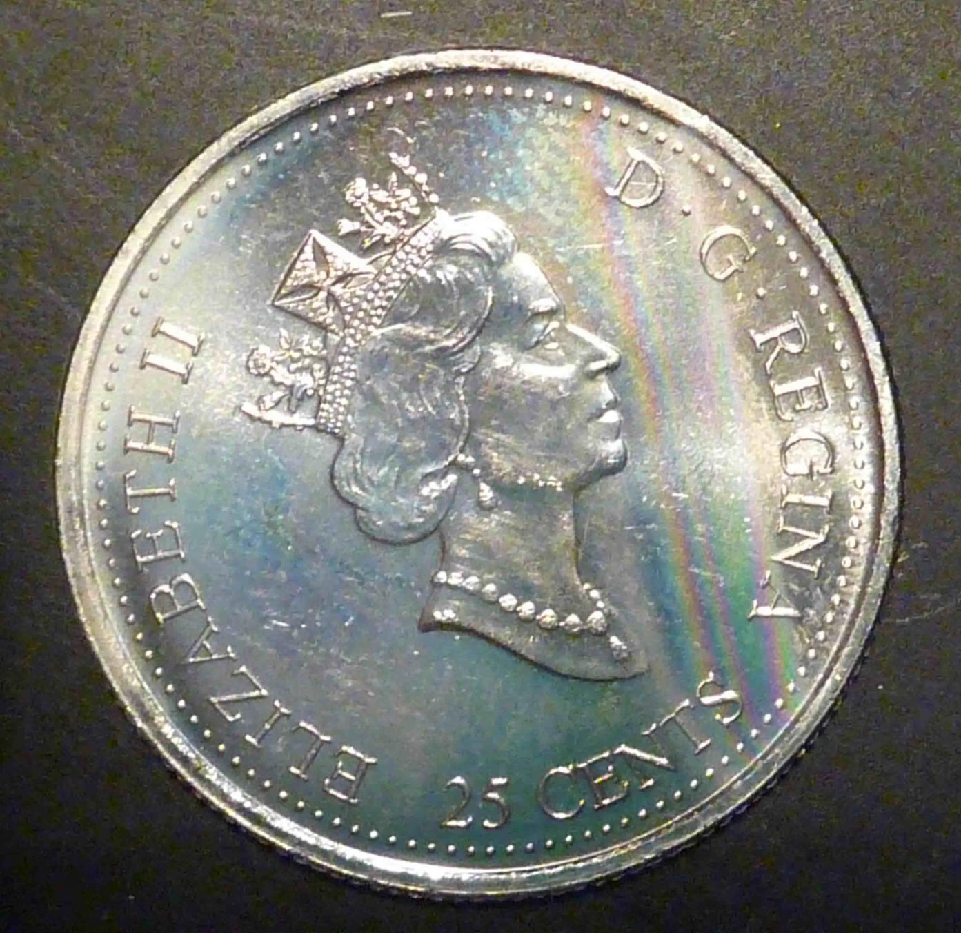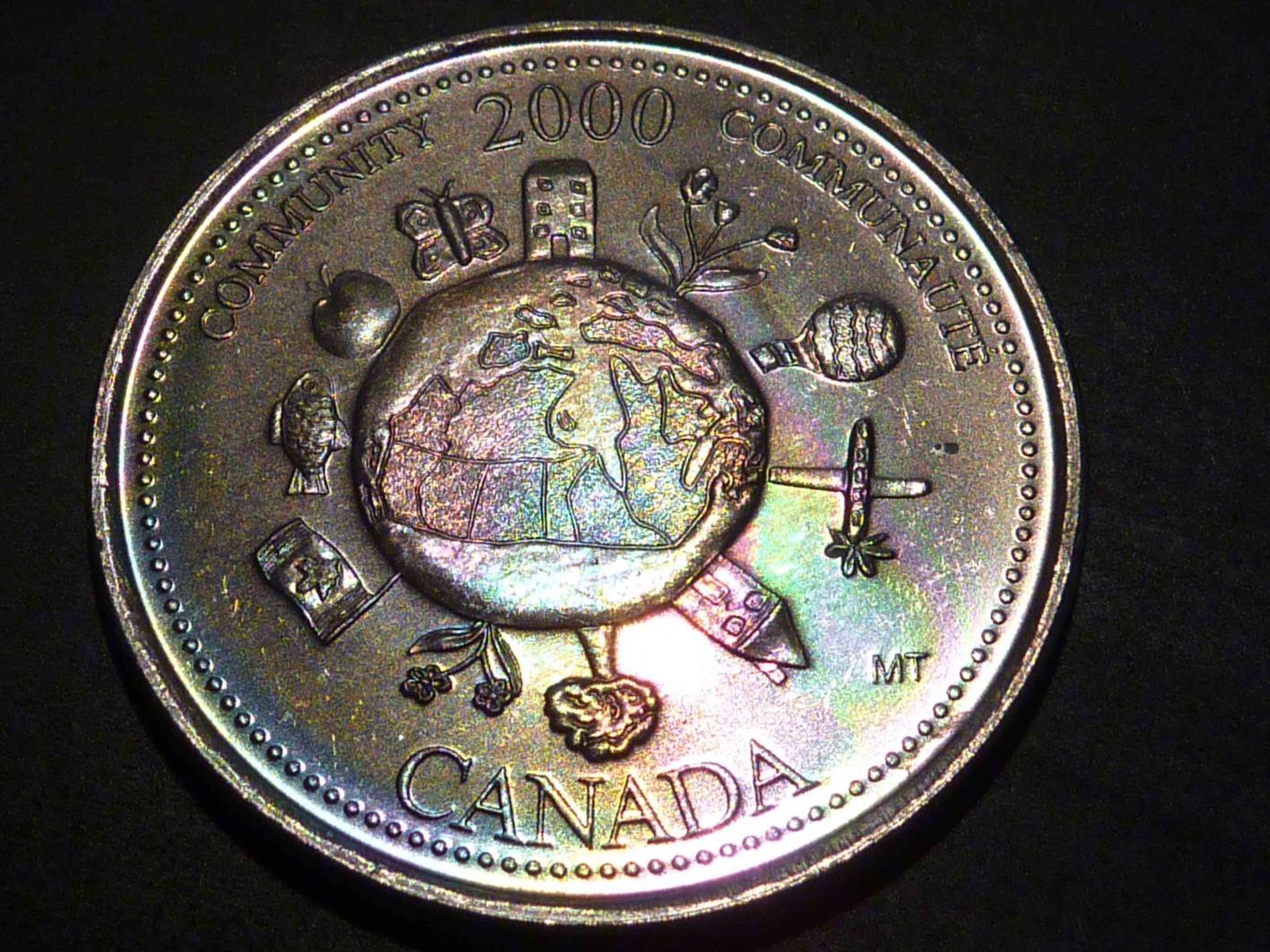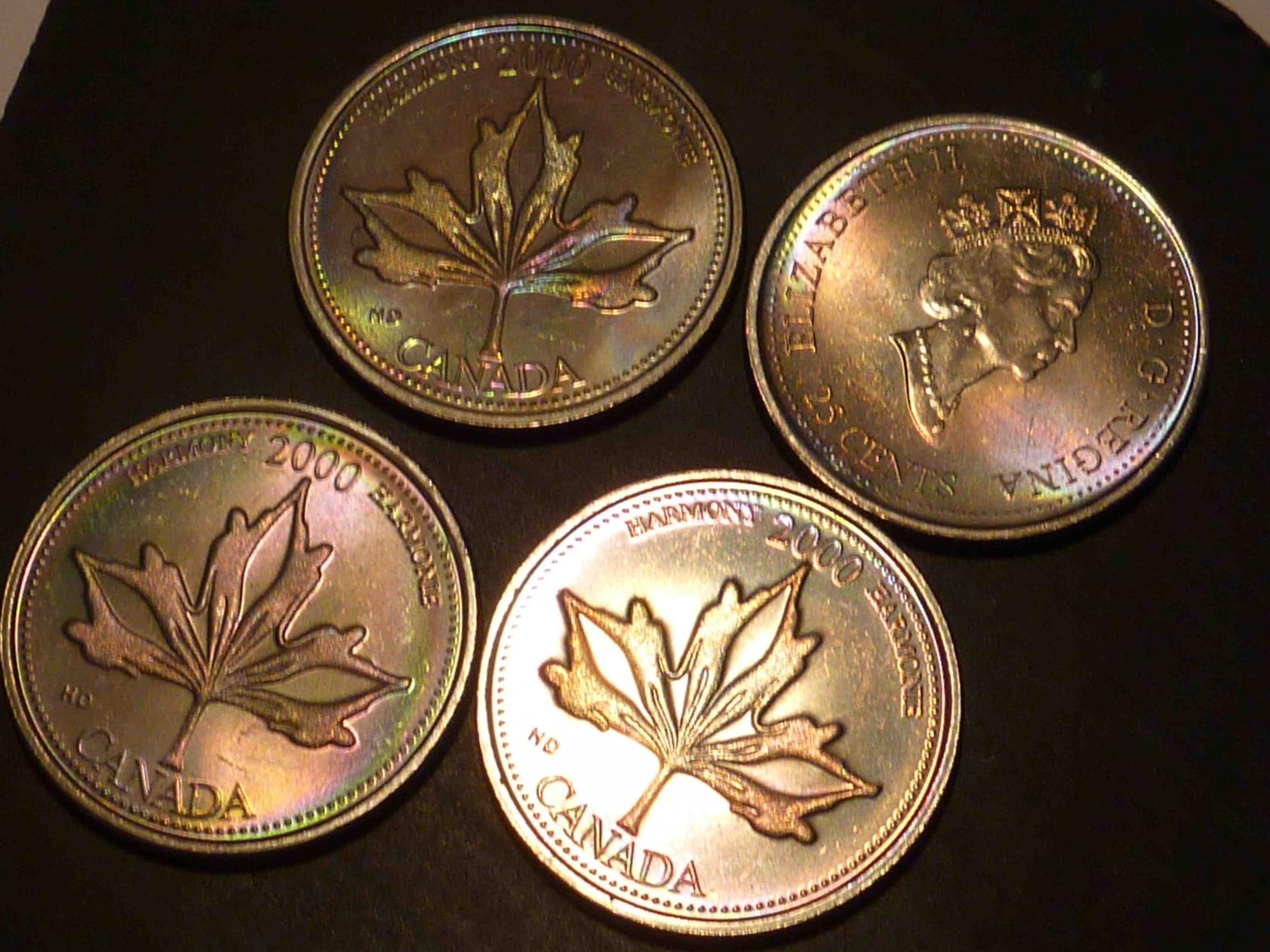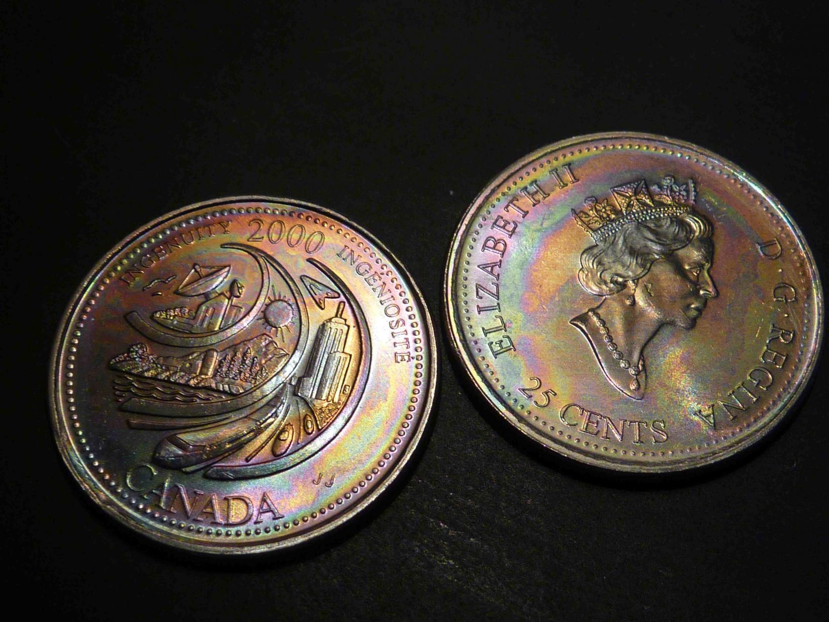 However, I digress... I did send one to a Canadian third party grader (ICCS), and they too thought it was naturally toned. It was one with a soft, uniform bulls-eye rainbow tone, and it came back MS-65 (probably MS-66 equivalent with PCGS standards, although I doubt they would encapsulate it). I don't collect Canadian nickel 25-cent coins, but I thought it was fun to try. http://www.ebay.ca/itm/GEM-TONED-Canada-25c-2000-Harmony-June-ICCS-MS-65-/290940849629