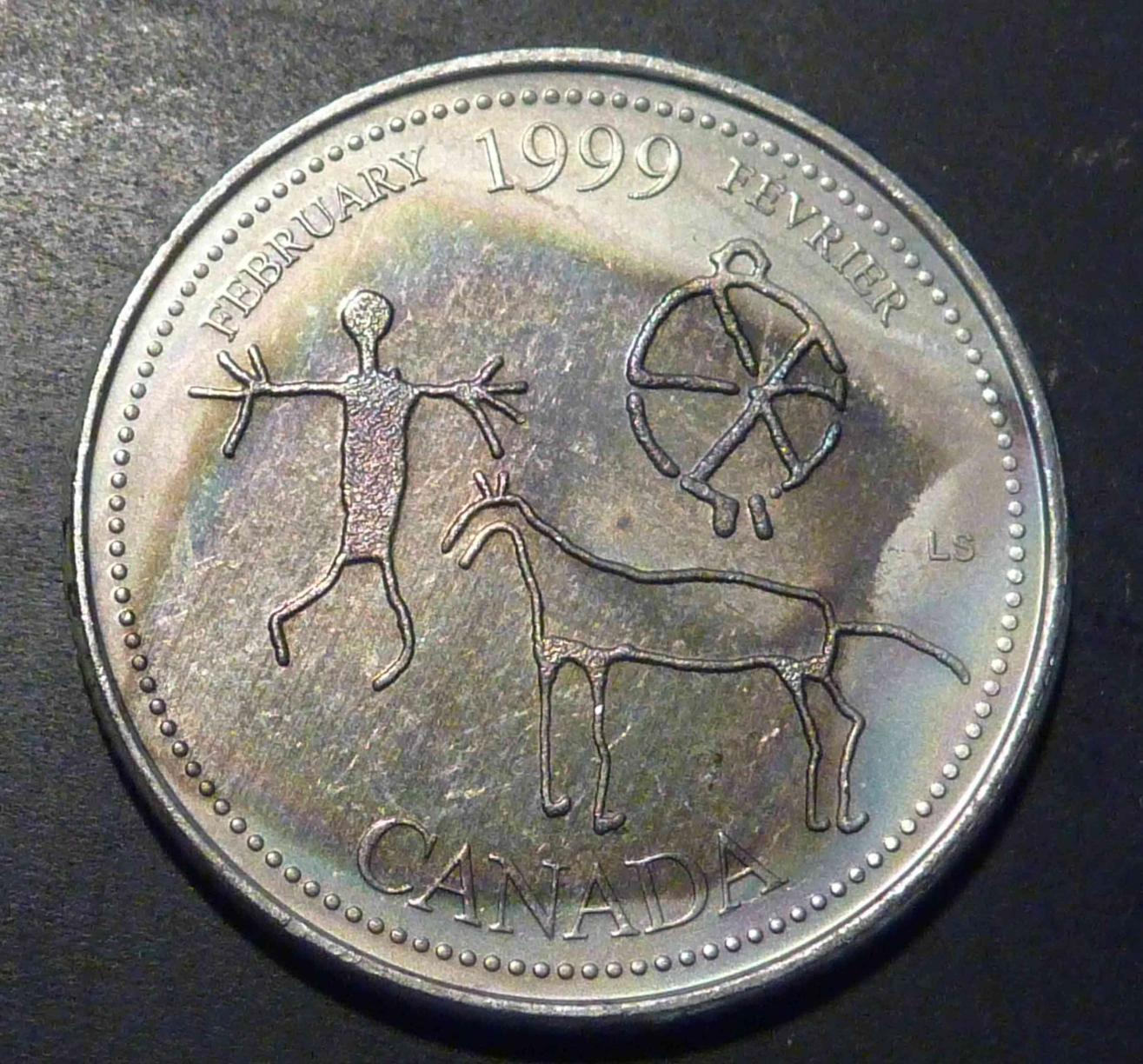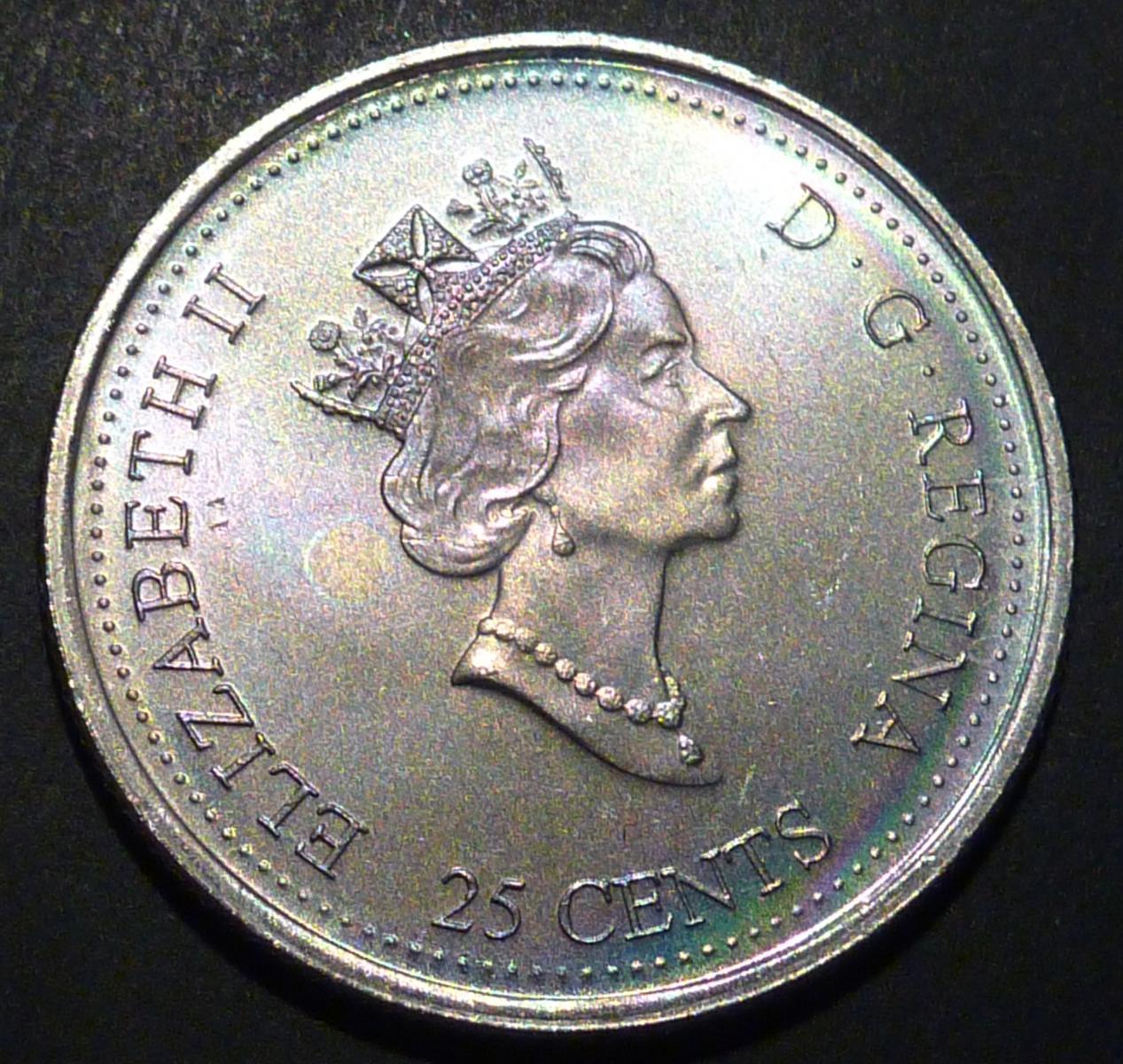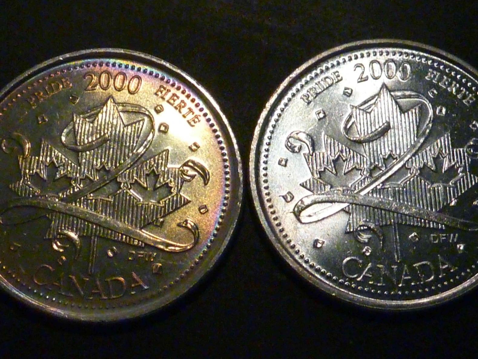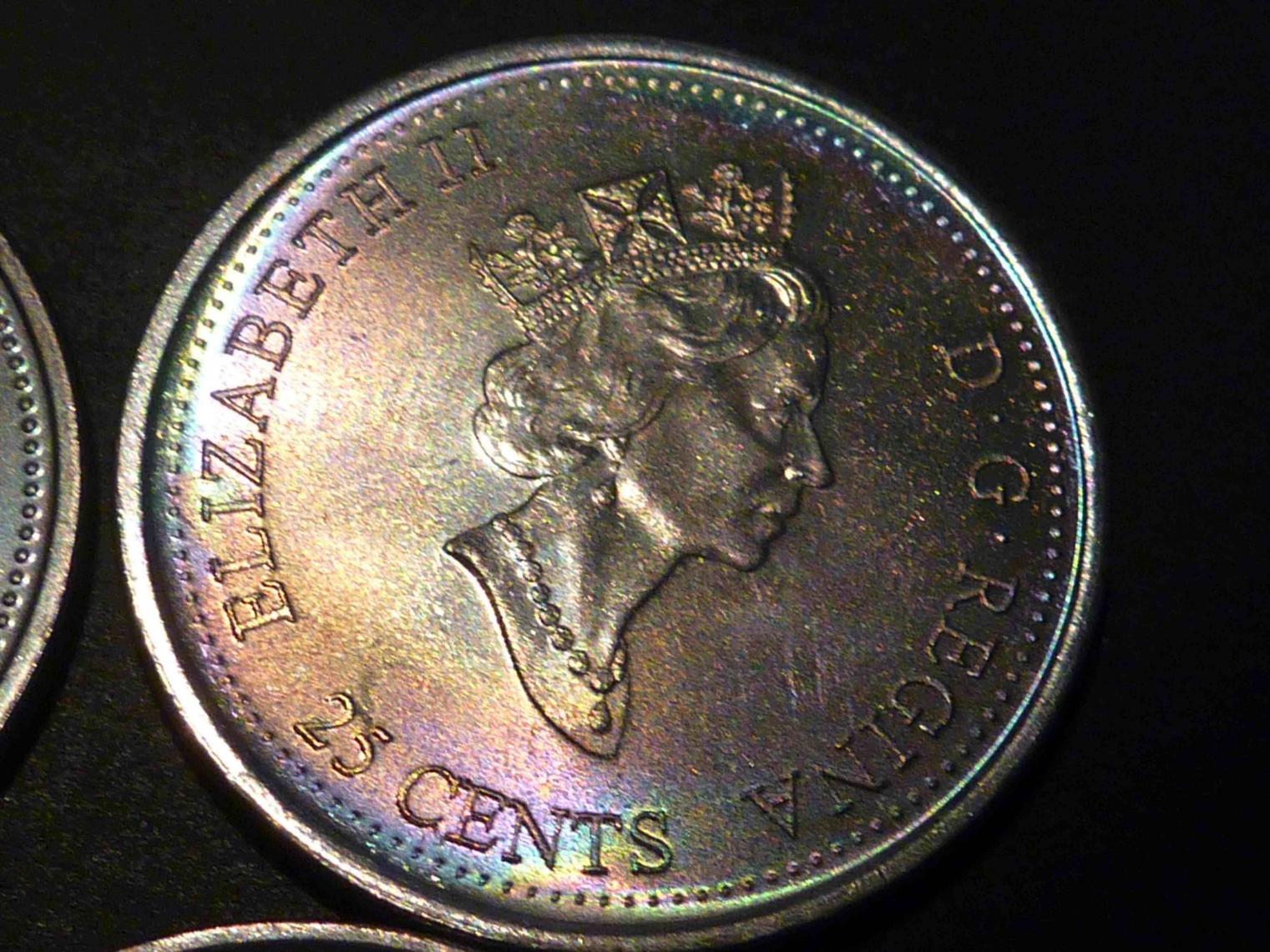 However, I digress... I did send one to a Canadian third party grader (ICCS), and they too thought it was naturally toned. It was one with a soft, uniform bulls-eye rainbow tone, and it came back MS-65 (probably MS-66 equivalent with PCGS standards, although I doubt they would encapsulate it). I don't collect Canadian nickel 25-cent coins, but I thought it was fun to try. http://www.ebay.ca/itm/GEM-TONED-Canada-25c-2000-Harmony-June-ICCS-MS-65-/290940849629