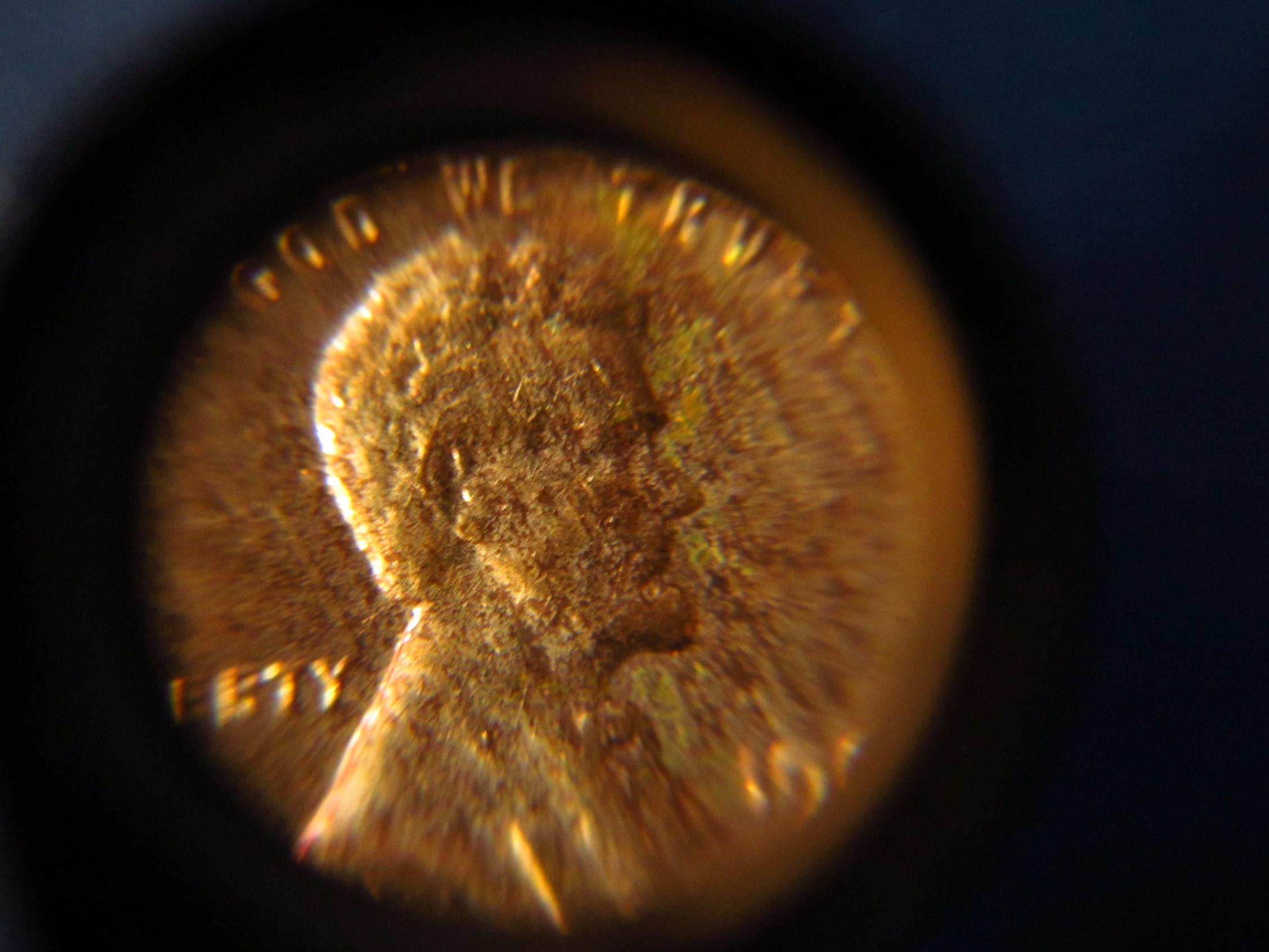 i found this in a uncirculated bank roll. what is the cause this? it doesnt have any pitting or de-lamination that i can see with my loupe or blown up on my tv. but the pattern is weird. almost like fabric. the reverse is toned dark magenta. is this toning or some kind of damage?