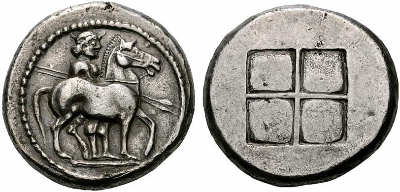 I like best the oktadrachm. I suspect that the surface issues drove away the female bidders who did not weight in the provenance factor. This die is particularly well engraved, as the engraver wisely let one leg of the horse and one leg of the man overlap. There are others where the man's legs seem to be disconnected and advancing in front of his body: