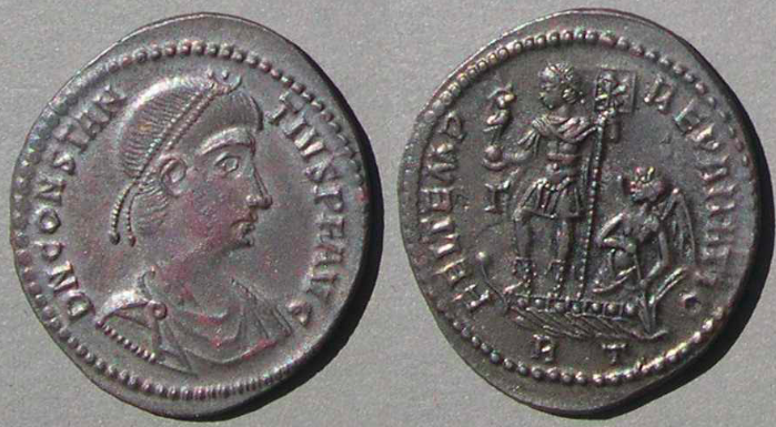 I think that these make an interesting contrasting pair. Constans - AE2 Obv:- D N CONSTANS P F AVG, Pearl diademed, draped & cuirassed bust right Rev:- FEL TEMP-REPARATIO, emperor in military dress standing left on galley, holding Phoenix and labarum, Victory sitting at the stern, steering the ship Minted in Aquileia; (//AQP dot), A.D. 348-350 Reference:– RIC VIII Aquileia 99 (Rated Common) and a barbarous imitation of the same type