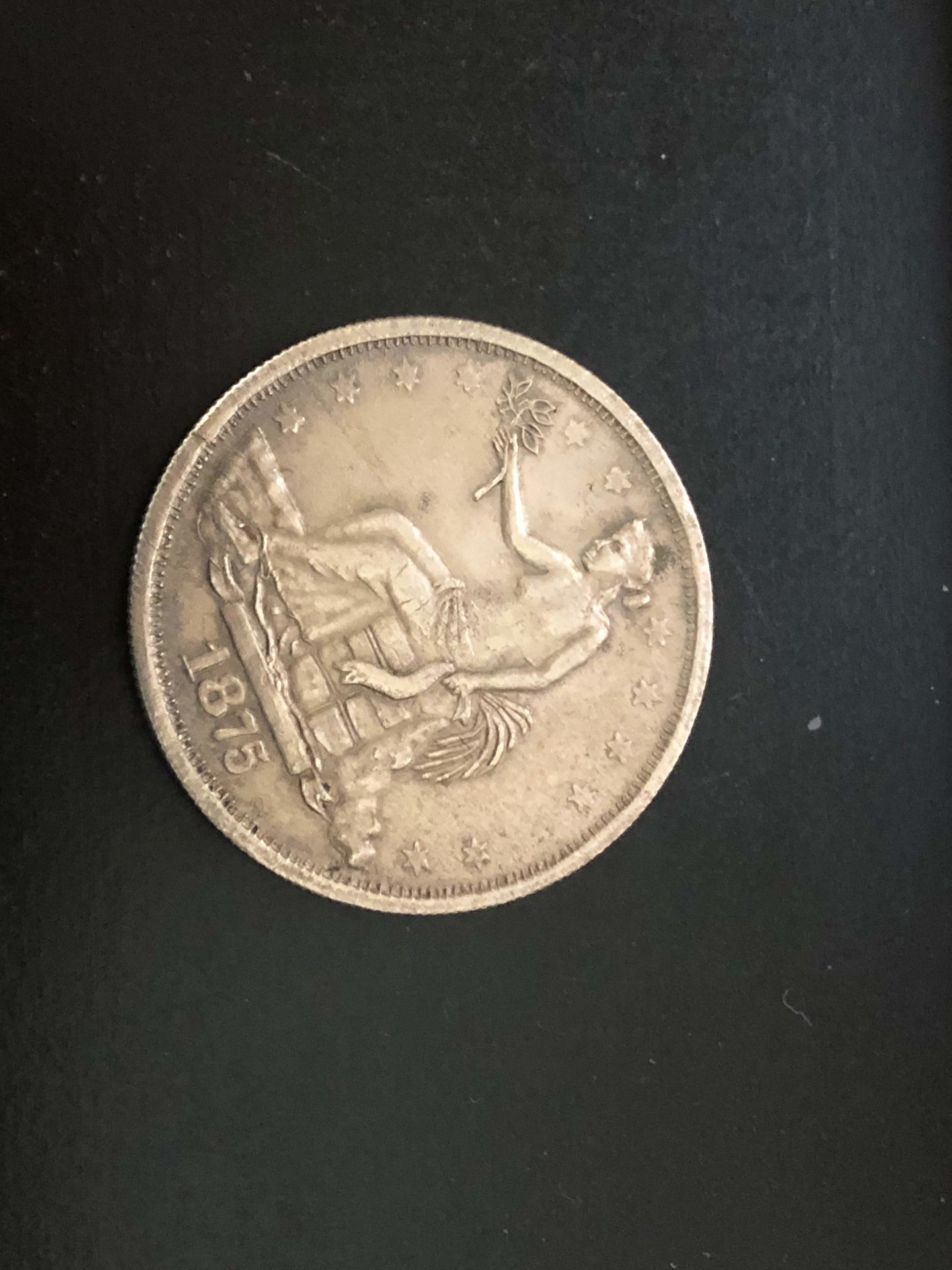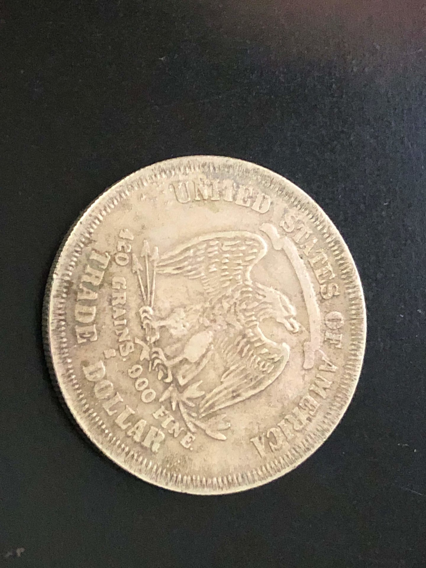 Welcome to CoinTalk, but... 1) It's not a silver dollar. At least, not a real one. 2) It's almost certainly not 90% silver. 3) Trade dollars were issued to compete with other countries' coins in overseas trade. 4) If it were real, it would be worth much more than a common Morgan or Peace dollar, but probably less than a Seated or Bust dollar. As a fake, it's worth less than a silver dollar. 5) It's not old. 6) It's not good to pass counterfeits on to your kids. Other than that, though...