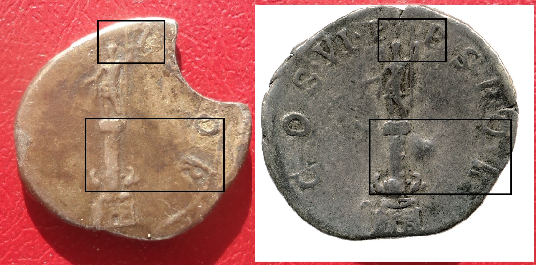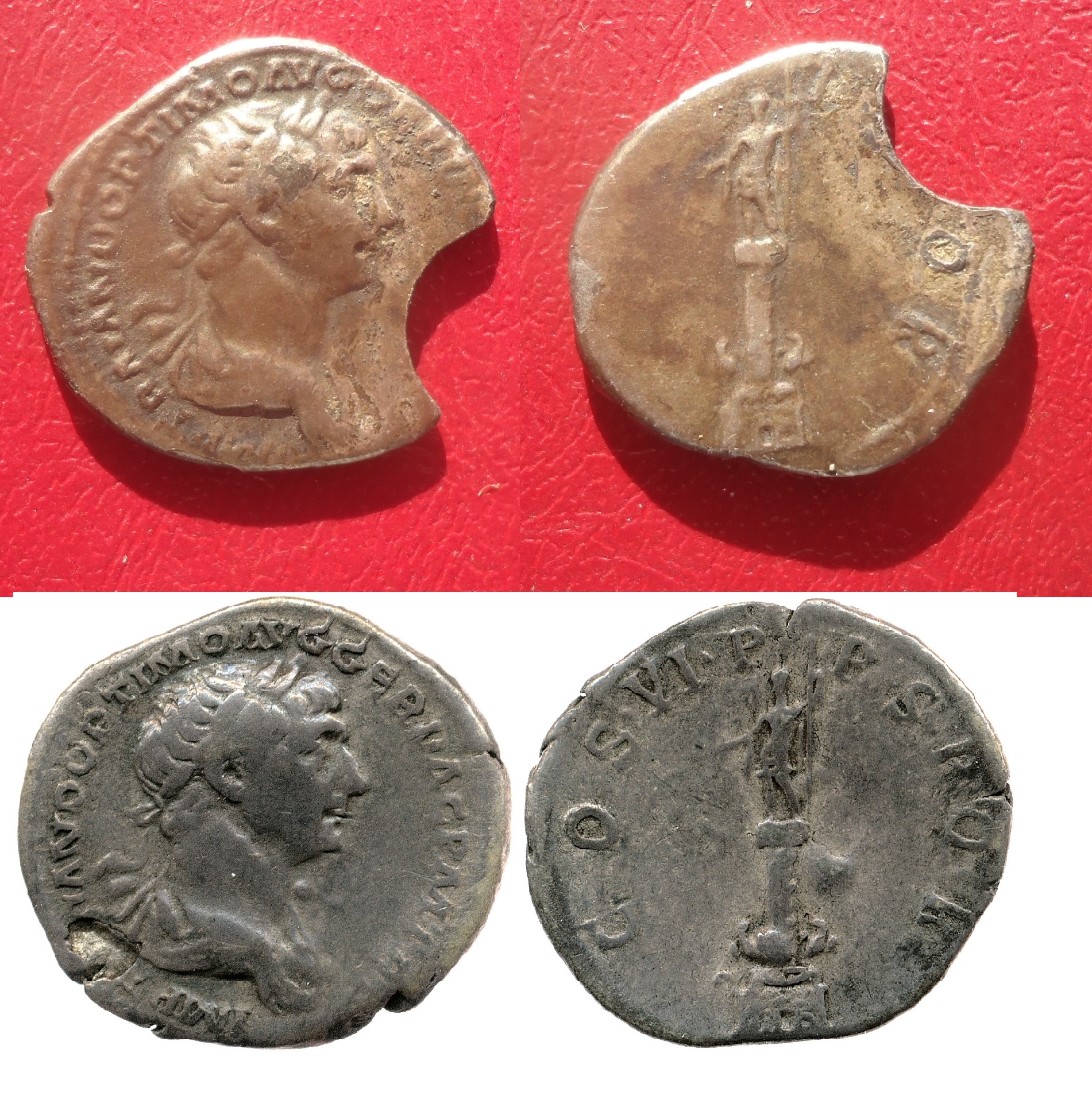 This was such a great Trajan thread I thought I'd revive it since I finally got a Trajan's Column denarius. Difficult to see in this photo, but this coin has a very tiny edge flaw. Despite this, I thought it still worth $14.99 given the column and Trajan's portrait were not affected. The eBay listing title was "Roman 237 249 AD Denarious Silver Philip II Antoninianus," which helped suppress bidder interest. Below is a close-up of the tiny, almost imperceptible edge flaw. It does not appear to be a fourree, but rather, I suspect, the silver has crystalized, but it is peculiar how smooth the edge is. Or did the Cookie Monster get to in during one of his frenzies? Since Cookie Monster doesn't appear to have any teeth, his bite mark may look like this. Or is the whole thing just a fake? It is a bit light-weight at 2 grams, although the tiny edge flaw may account for this. Also, why is it I can't find that the SPQR on the back is separated by dots in any of the descriptions? This seems fairly apparent on a lot of the examples of this type I found online (not just RIC 307), but I never see it noted. Dots have been added to my description: Trajan Denarius (114-117 A.D.) Rome Mint IMP TRAIANO OPTIMO AVG GER DA[C PM TRP] laureate and draped bust right. / [COS VI P]P S[•P]•Q•R Trajan's column with statue of Trajan holding scepter and globe, two eagles at base. RIC 307; BMC 523 (2.00 grams / 18 mm) eBay Dec. 2020 $14.99 Finally, I'd like some opinions, please: is this a die match to a specimen in the British Museum? https://www.britishmuseum.org/collection/object/C_R-11738 Here are some more photos - the British Museum specimen is the round one on the bottom: