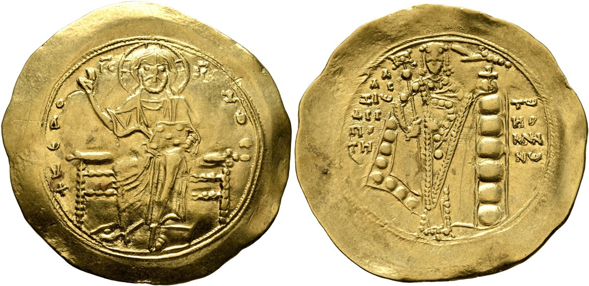 Alexius I Comnenus, 1081-1118. Hyperpyron (Gold, 31 mm, 4.30 g, 6 h), Constantinopolis, post-reform coinage, 1092-1118. +ΚЄ ROHΘЄI Christ, nimbate, seated facing on throne, raising his right hand in benediction and holding book of Gospels in his left; in fields, IC - XC. Rev. A/ΛЄ/ΖΙω / ΔЄC/ΠΟ/ΤΗ; in right field, Tω / KO/MNH/Nω Alexius I standing facing, wearing crown, divitision and exagerrated jewelled chlamys, holding labarum with his right hand and globus cruciger with his left; in upper right field, manus Dei to left. SB 1913. Slightly clipped and with a very minor graffito of X on the obverse, otherwise, about extremely fine.