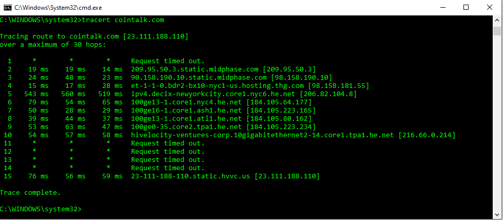 When you see a chain of timeouts like that in one section of the route, but success at the end of the route, it usually just means that the routers in that section are configured to ignore ICMP requests. Seems kind of anti-social to me, but it's not at all uncommon.