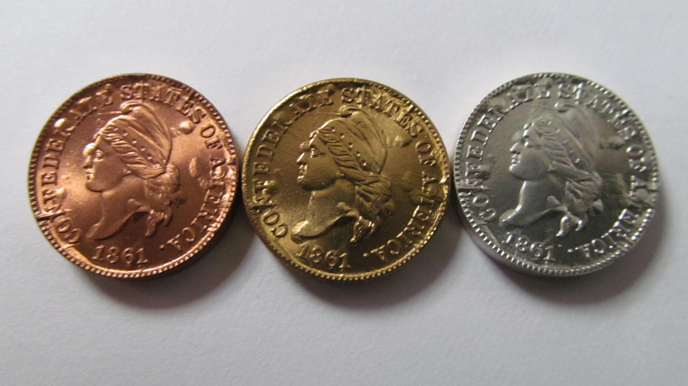 Riff, are you sure those are genuine? The original ones are a little thick, but that one you show on it's side looks too thick. Many counterfeits of the original counterfeits were produced, and the easiest way to tell is they are too thick. I am not saying they are fake, just mentioning it. I can't find the actual dimensions of the re-strikes. And for those wondering what these are, they are Bashlow re-strikes. In 1961, Robert Bashlow used defaced confederate dies to create some re-strikes. Here is more info: http://www.rebelstatescurrency.com/bashlow.html