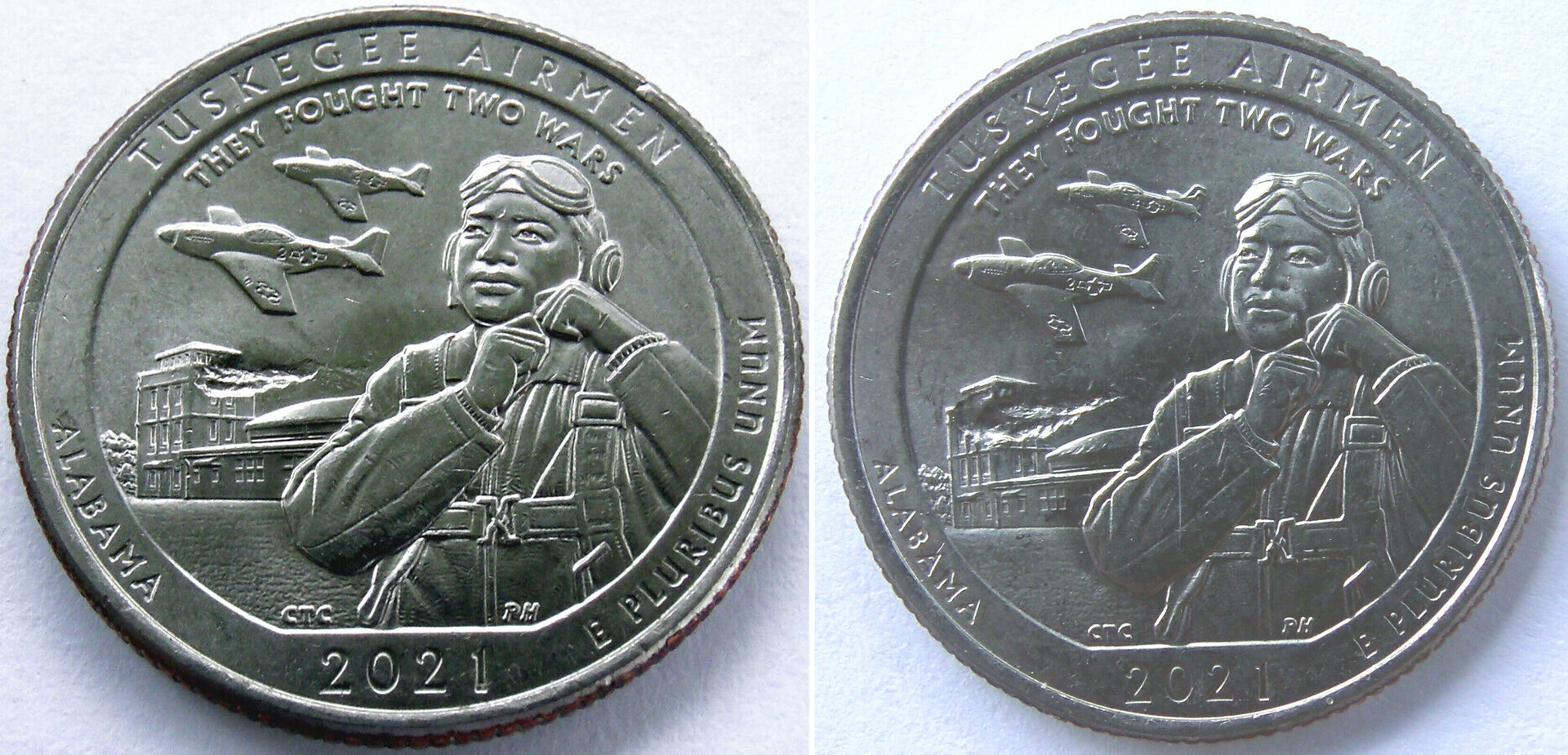 I searched through 3 $500 bricks of Quarter's over the last week and this last box gave me some great finds. So far I've found a W mint marked V75 Salt River Bay, a 2008 Alaska crossed claw die chip, 2 Washington Crossing the Delaware hat die chips, and a 2021 Tuskegee Airman Quarter with a die chip that completely covers the upper aircraft cockpit! I believe it might be a first. I haven't seen one like this reported. I could be wrong but.....All the error's I've seen reported so far is the "burning building" and a die chip above the Pilots helmet. If I'm wrong about this find someone please let me know. here's some pics.