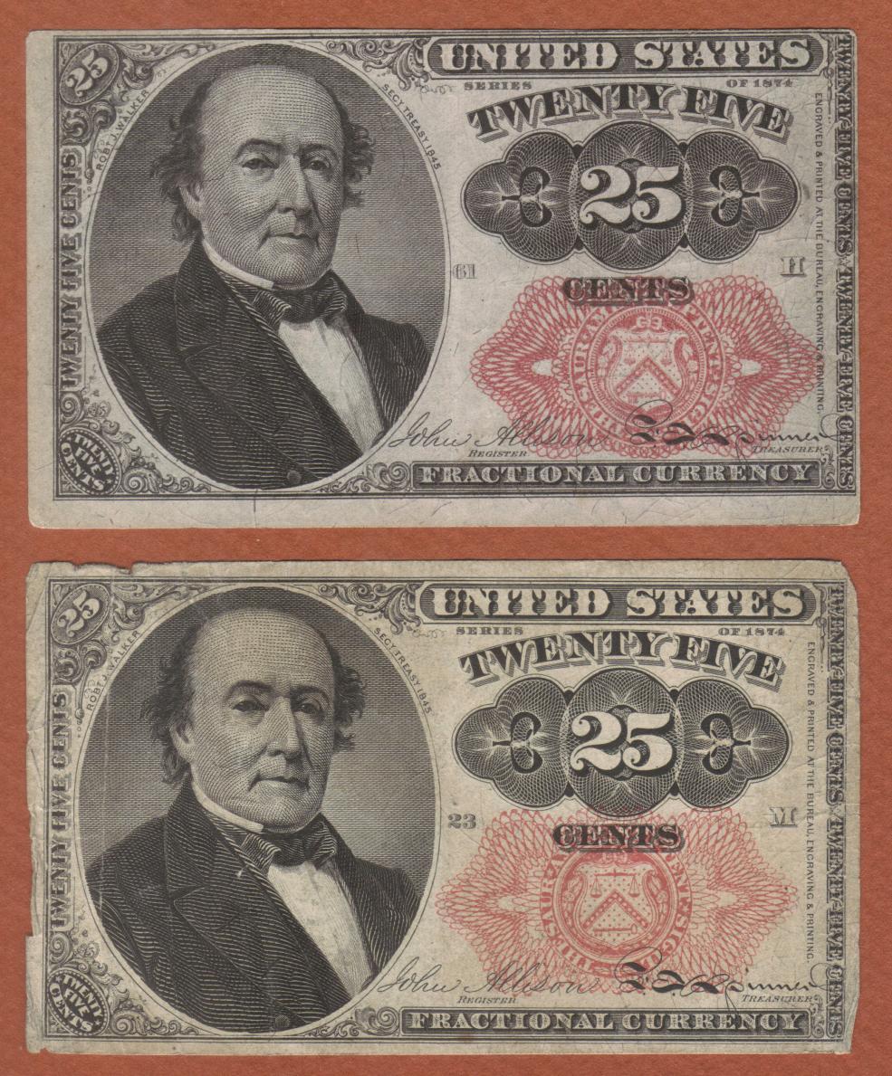 Two 25c Fractional Currency, Robert Walker, Fr. 1308 Long Key and Fr. 1309 Short Key