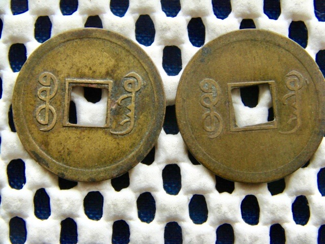 Could someone please identify these two Chinese coins for me. They look to be identical and the metal has a smooth finish, they do not look to be very old. Weight 2.8g and 3.1g Diameter approx 25mm. I can't even tell if I have them the correct way round ! Many thanks Brian.