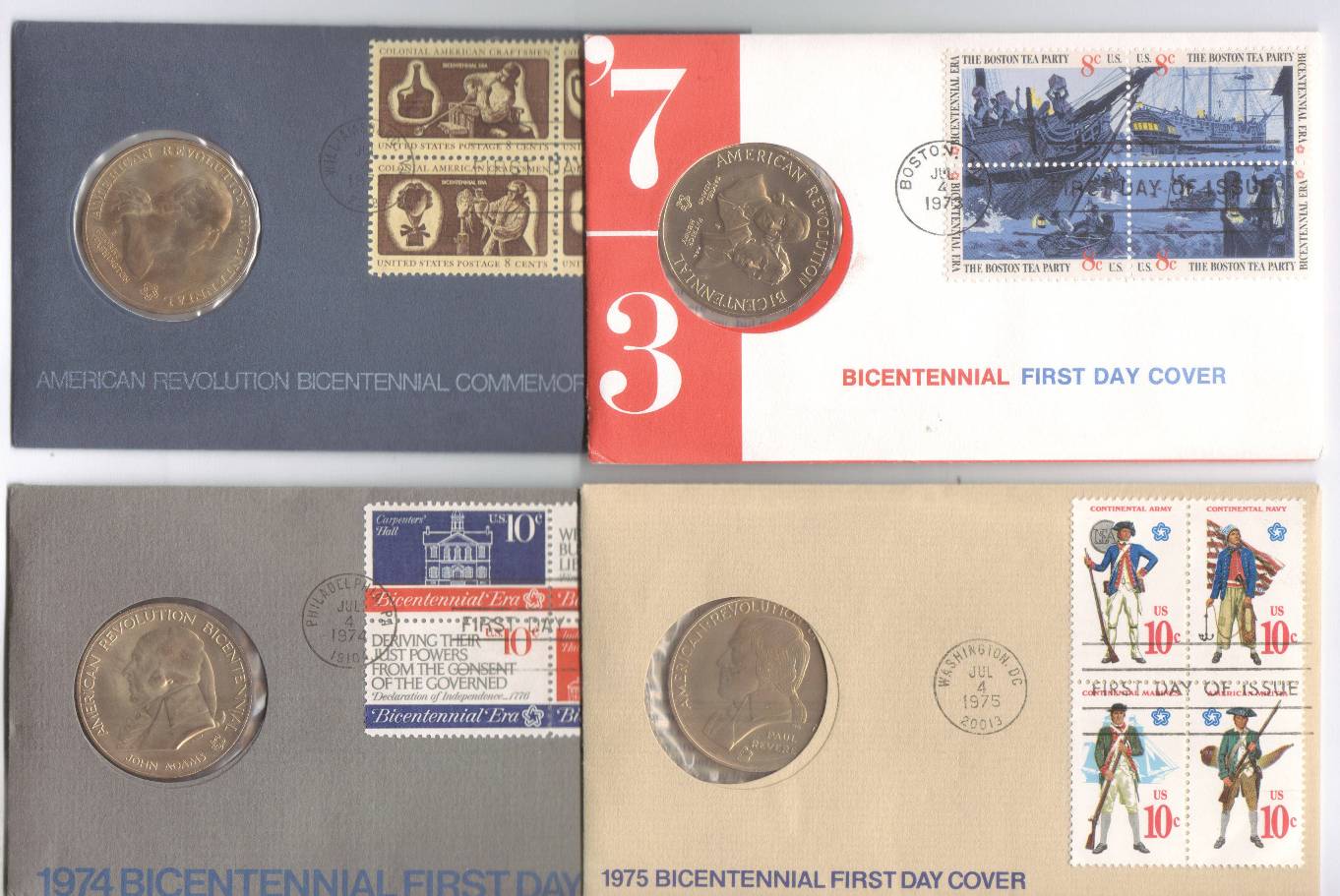 Price for 16 medals, $79 postpaid and insured. PayPal or money order. From 1973 to 1976, the U.S. Mint, in conjunction with the Smithsonian, produced a very nice Bicentennial item, a set of 11 pewter medals, along with a 44-page booklet describing the medals and their history, all housed in a blue album somewhat similar to a Whitman Bookshelf in size and appearance. Ten of the medals were reproductions of colonial medals commemorating battles of the American Revolution, and the 11th (at the center, in the image) was a reproduction of the 1789 seal of the Treasury Department. The image shows the medals as they appear in the album page, with a quarter added for size comparison. The Bicentennial is now nearly forty years behind us, but these few collections remain as a stunning reminder of those early American heroes and their sacrifices. This lot ALSO contains one 1972 U.S. Mint medal in a plastic case, as shown. Finally, this lot includes U.S. Mint medals for 1972, 1973, 1974, and 1975, set into official First Day Covers, as shown. The 1972 medal is the same as the 1972 medal in a plastic case, see above. KRV10