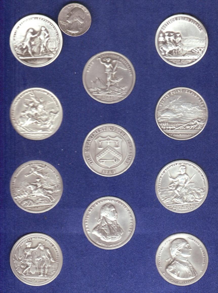 From 1973 to 1976, the U.S. Mint, in conjunction with the Smithsonian, produced a very nice Bicentennial item, a set of 11 pewter medals, along with a 44-page booklet describing the medals and their history, all housed in a blue album somewhat similar to a Whitman Bookshelf in size and appearance. Ten of the medals were reproductions of colonial medals commemorating battles of the American Revolution, and the 11th (at the center, in the image) was a reproduction of the 1789 seal of the Treasury Department. The image shows the medals as they appear in the album page, with a quarter added for size comparison. The Bicentennial is now nearly forty years behind us, but these few collections remain as a stunning reminder of those early American heroes and their sacrifices. Price, $50 postpaid and insured. PayPal or money order; no cash, please. Reference: American Philatelic Society Life Member #12078.